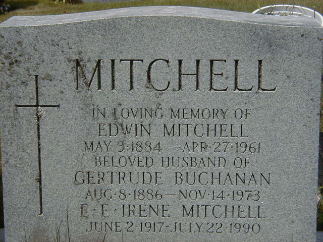 Edwin "Eddy" Mitchell was born on 3 May 1885 at Cramahe Twp., Northumberland Co., Ontario; Birth Reg'n.#025093: Name: Eddy Mitchell; Date: May 3 1885; Parents: Samuel Mitchell & Esther Sweet; Inf.: Samuel Mitchell, farmer, Cramahe Twp; Reg'd.: May 10 1886; Phys.: Dr. Richards; Reg'r.: H. P. Gould, Cramahe Twp. (Ontario Birth Registration, #025093-1886, ancestry.com) Date May 3 1884 per Memorial. Date May 3 1886 & location Ont. rural per 1901 Census. Date 1886 & location Ont. per 1891 Census. Date 1886 per marriage reg'n.2,5,6,7,8 He appeared on the census of April 1891 at Cramahe Twp., Northumberland Co., Ontario; Age 5 at 1891 Census: see Samuel Mitchell.8 He appeared on the census of April 1901 at Cramahe Twp., Northumberland Co., Ontario; Age 15 at 1901 Census: see Samuel Mitchell.5 He lived in 1911 at Conc 10 Lot 21 & 22, Cramahe Twp., Northumberland Co., Ontario; The 1911 for Cramahe shows an "Edmond" living with Wilbert Mitchell and Ester, his mother. This would be Edwin, not Edmond. They were living at Conc 10, Lots 21 & 22 - in the north end of Cramahe Twp.3 He appeared on the census of 1911 at Cramahe Twp., Northumberland Co., Ontario; Age 26 at 1911 Census: see Wilbert Mitchell (brother.)3 He was Occupation: Merchant - per marriage reg'n. on 15 July 1914 at Percy Twp., Norham, Northumberland Co., Ontario.9 He married Gertrude G. "Gertie" Buchanan, daughter of John Buchanan and Elizabeth Stuart, on 15 July 1914 at Percy Twp., Norham, Northumberland Co., Ontario; Marriage Reg'n.#016324: Groom: Edwin Mitchell; Age: 28; Res. & Born: Norham; Status: bachelor; Occ.: merchant; Parents: Samuel Mitchell & Ester Sweet; Bride: Gertrude Buchanan; Age: 27, Res. & Born: Norham; Status: spinster; Parents: John Buchanan & Elizabeth Stuart; Date: 15 July 1914; Place: Norham; Witnesses: Ben Buchanan, Norham & Abbie Smith, Ottawa; Reg'd: July 10, 1914; Reg'r.: Thomas A. Allen; Rel.: Methodists; Performed by: Rev. H. C. Corbett (Ontario Marriage Registration, ancestry.com, #016324-1914.)1,10 Edwin "Eddy" Mitchell lived on 8 July 1918 at Percy Twp., Norham, Northumberland Co., Ontario; Informant for Death Reg'n. of his mother Esther (Sweet) Mitchell.11 He died on 27 April 1961 at Scarborough, York Co., Ontario, at age 75; Date April 27, 1961 per Memorial. Date Mar 1961 & location Toronto per Marilyn (Mitchell) Nixon, uly 22, 2006.6 He was buried on 29 April 1961 at Pine Hills Cemetery, Scarborough, York Co., Ontario; Memorial: (See Exhibit) MITCHELL; In Loving Memory of; Edwin Mitchell; May 3 1884 - Apr 27 1961; Beloved Husband of; Gertrude Buchanan; Aug. 8, 1886 - Nov 14, 1973; E. E. Irene Mitchell; June 2, 1917 - July 22, 1990 (Pine Hills Cemetery, Sec 5, Plot 1967, July 26, 2006)
