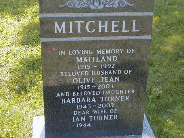 Maitland Mitchell was born on 13 August 1915 at Percy Twp., Norham, Northumberland Co., Ontario; Date Aug 13 1915 & location Norham per Marilyn (Mitchell) Nixon, uly 22, 2006. Date 1915 per Memorial.1,2 He married Olive "Jean" McLaughlin on 6 September 1939 at Ontario, Canada; Date Sep 6 1939 per Marilyn (Mitchell) Nixon - via email Sep 28 2009.1,3 Maitland Mitchell died on 2 August 1992 at Scarborough General Hospital, Scarborough, York Co., Ontario, at age 76; "Deaths: ... Mitchell - S - Maitland - At Scarborough General Hospital on Sunday, August 2, 1992, Maitland, beloved husband of Jean. Dear father of Marilyn and her husband Rin Nixon. Barbara and her husband Ian Turner. Ed and his wife Pam Mitchell and Ken Mitchell. Sadly missed by his grandchildren Fred, Margie, Danielle, Daniel, Brie, Trevor and the late Jonathan Maitland. Will be sadly missed by his relatives, friends and all who knew him. Resting at Ogden Funeral Home, 4164 Sheppard Ave., East, Agincourt (east of Kennedy Rd.), Tuesday 2 - 4 and 7 - 9 pm. Funeral Service complete in the Chapel Wednesday 2 pm. Private interment Pine Hills Cemetery .. " from The Toronto Star, August 4, 1992, pg. D20, seen on microfilm at The Toronto Metro Reference Library, July 25, 2006.