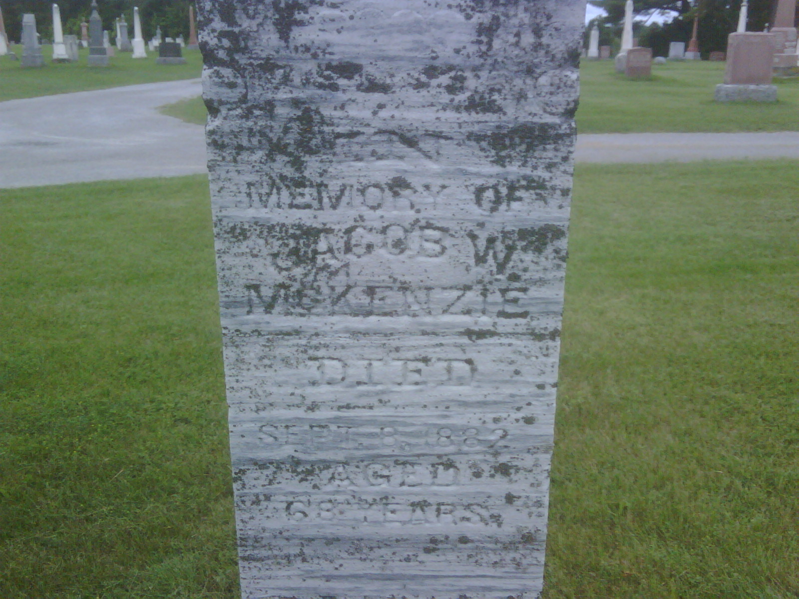 CemSeasrch: Name: Jacob W. McKenzie; Born: 1814; Died: Sep 8 1882; Age: 68; ID: WRKWTH0998; Other names: McKenzie, Catherine [Lovett](1818-1904), McKenzie, Charles Saylor )1851-1925), McKenzie, Eliza Adelia [Stickle](1855-1945); Cemetery: Warkworth Cemetery, Conc 3, Lot 15, Percy Twp., Warkworth, Northumberland Co., Sec 2 Row V Plot 25; Note: Husband of Catherine Lovett. Father of Charles (Eliza A. Stickle), Sarah Jane (W.R.) Losie and Adelia (Hiram Darling) Lawrence. (https://www.cemsearch.ca/burial/?pid=WRKWTH0998%5E2.)5,4