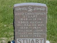 "Mrs. David C. Stuart; died ?; April 11, 1924; Brighton Ensign" Date 1924 per Memorial.1,15,2,16 She was buried on 11 April 1924 at McPhail's Cemetery, Brighton Twp., Northumberland Co., Ontario; Memorial: (See Exhibit) David Christoper; Stuart; 1858 - 1939; Abbie Keziah; Valleau, his wife; 1858 - 1924; William John; Stuart, his brother; 1839 - 1924; STUART (McPhail's Cemetery, Brighton Twp.)2