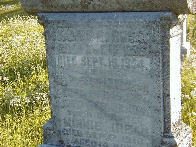 Tweedsmuir Histories: "A gray upright stone is erected to the memory of James Ross, 1866-1954, his wife Marthy Irean Valleau, 1871-1911, his daughter Minnie Irean, 1899-1913, a son George, 1906-1960, and Jas.' second wife Emma King, 1875-1963."1,16