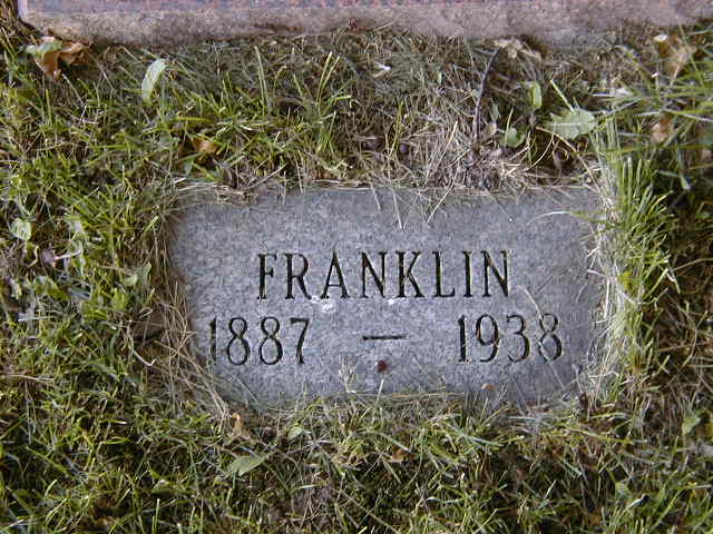 from "Massey History" seen at Cobourg Pulbic Library.6 Franklin Percival Massey lived on 10 December 1915 at Brighton, Northumberland Co., Ontario; Attestation Paper WW I: Name: Frank Percival Massey; Res.: Brighton; Born: Cramahe, Oct 22 1883; Kin: Mrs. Pearl Massey, wife; Trade: Manufacturer's Agent; Married: yes; Date: Dec 10 1915, Brighton (ancestry.com.) He died on 25 December 1938 at Ontario at age 57; Date Dec 25 1938 per CEMSearch. from "Massey History" seen at Cobourg Pulbic Library.7 He was buried on 27 December 1938 at Stone's Cemetery, Percy Twp., Northumberland Co., Ontario; Memorial: (See Exhibit) Franklin; 1887 - 1938 (Stone's Cemetery, Percy Twp., June 26 2007)(footstone)