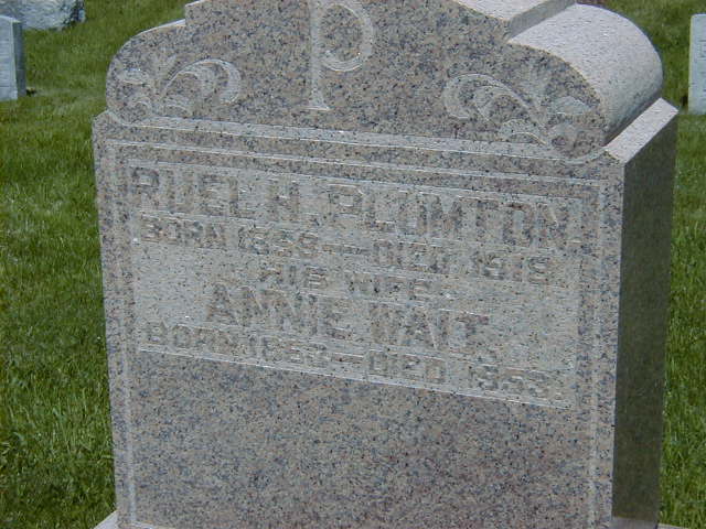 Annie J. Waite was born on 25 November 1863 at Brighton Twp., Northumberland Co., Canada West; Date 1863 per Memorial. Date Nov 25 1863 & location Ont. rural per 1901 Census. Date 1864 & location Ont. per 1891 Census. Date 1864 & location UC per 1870 US Fed. Census. Date 1862 & location Brighton Twp. per marr. reg'n.4,1,2,3 She appeared on the census of 28 July 1870 at Verona, Dane Co., Wisconsin, U.S.A; Age 6 at 1870 US Fed. Census: see John D. Wait.3 As of 15 April 1884,her married name was Plumton. She married Ruel "Herman" Plumton, son of James Plumpton and Pamelia Clark, on 15 April 1884 at Campbellford, Northumberland Co., Ontario; Marriage Reg'n.#008089: Groom: Ruel H. Plumpton; Age: 26; Res. & Born: Brighton; Status: bachelor; Occ.: farmer; Parentsd: James & Pamelia Plumpton; Bride: Annie Waite; Age: 21; Res. & Born: Brighton; Status: spinster; Parents: Dorland & Isabella Waite; Wit.: Naomi Joice & Bell Denike, Campbellford; Date: Apr 15 1884; Place: Campbellford; Rel.: Epis. Meth; Performed by: R. N. Denike; Reg'r.: Daniel Kennedy (Ontario Marriage Registration, #008089-1884, ancestry.com) per 1891 Census.4,5 Annie J. Waite appeared on the census of April 1891 at Brighton Twp., Northumberland Co., Ontario; Age 27 at 1891 Census: see Ruel Herman Plumpton.4 She appeared on the census of April 1901 at Brighton Twp., Ontario; Age 37 at 1901 Census: see Ruel H. Plumton.6 She was buried in 1953 at McPhail's Cemetery, Brighton Twp., Northumberland Co., Ontario; Memorial: (See Exhibit) Reul H. Plumton; Born 1858 - Died 1918; His Wife; Annie Wait; Born 1863 - Died 1953 (McPhail's Cemetery, Brighton Twp.)1 She died in 1953 at Ontario; Date 1953 per Memorial.1
