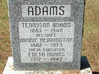 Alpheus Tennyson Adams was born on 8 October 1882 at Brighton Twp., Northumberland Co., Ontario; Birth Reg'n.#023950: Name: Alpheus T. Adams; Date: Oct 8 1882; Parents: Robert S. Adams & Clarissa Ann Delong; Inf.: Robert S. Adams, Brighton Twp., farmer; Phys.: Dr. Mallory; Reg'd.: Dec 21 1882; Reg'r.: C. Richmond, Brighton Twp. (Ontario Birth Registration, #023950-1882, ancestry.ca) Date Oct 1883 & location Ont. per 1911 Census. Date Oct 8 1883 & location Ont. rural per 1901 Census. Date 1884 & location Ont. per 1891 Census. Date 1883 per Memorial.5,6,2,7,8 He appeared on the census of April 1891 at Brighton Twp., Northumberland Co., Ontario; Age 7 at 1891 Census: see R. J. Adams.9 He appeared on the census of April 1901 at Brighton Twp., Northumberland Co., Ontario; Age 17 at 1901 Census: see Clarissa Adams.10 He married Minnie Herrington, daughter of George Manley Herrington and Mary Ann Carr, on 20 June 1906 at Brighton Twp., Orland, Northumberland Co., Ontario; Marriage Reg'n.#014469: Groom: Alpheus Adams; Age: 23; Res. & Born: Codrington; Status: bachelor; Occ.: farmer; Rel.: Meth; Parents: Robert S. Adams & Clarissa Delong; Bride: Minnie Herrington; Age: 23; Res. &Born: Orland; Status: spinster; Rel.: Meth; Parents: George Herrington & Mary Carr; Wit.: Edgar Adams, Codrington & Iva Herrington, Havelock; Date: Jun 20 1906; Date: Jun 20 1906; Place: Orland; Performed by: Rev. G. E. Ross; Reg'r.: Fred O. Wade (Ontario Marriage Registration, #014469-1906, ancestry.com.)11 Alpheus Tennyson Adams lived on 7 March 1908 at Conc 7 Lot 31, Brighton Twp., Northumberland Co., Ontario; Land Registry Records (Grant 8254) show that Clarissa A. Adams, widow, Edwin Adams & wife, Edgar Adams & wife, Byanea B. Snider & Reta A. Milner granted the west half 100 acres of Lot 31, Conc 7 to Alfred F. Adams for $4,500. ITS Date: Mar 7 1908. Reg'n. Date: Apr 24 1908. (Ontario Land Registry Records, Northumberland Co., Brighton Twp., Conc 7, pg. 196 of 239, Lot 31, pg. 2, page copied from Onland.ca, Feb 22 2021.)12 He appeared on the census of 1911 at Brighton Twp., Codrington, Northumberland Co., Ontario; Age 27 at 1911 Census: Adams, Tennison, 27, b. Ont. Oct 1883, Irish, Meth., farmer, married; Minnie, 27, b. Ont. Sep 1883, Irish, Meth., married; Nichols, Roy, 16, b. Ont. Jul 1894, Eng., Meth., domestic (1991 Census: Brighton Twp., Codrington Village, dist. 101, sub-dist. 19, pg. 5, line 29 - Conc 7, W1/2 Lot 31 - ancestry.com.)7 He lived in 1911 at Conc 7 Lot 31, Brighton Twp., Codrington, Northumberland Co., Ontario; Residence per 1911 Census: Conc 7, Lot 31, West half, Brighton Twp. (location is immediate east side of Codrington, on east side of Marsh Creek.7 He appeared on the census of 6 June 1921 at Brighton Twp., Northumberland Co., Ontario; Age 38 at 1921 Census: Adams, T.A.(m), 38, b. Ont., p.b. Ont., Irish, Meth., farmer - own farm, married; M.J.(f), 38, b. Ont., p.b. Ont., Meth., married; E.(f), 8, dau. (1921 Census: Brighton Twp., Northumberland Co., dist. 107, sub-dist. 6, pg. 3, line 7 - ancestry.ca)