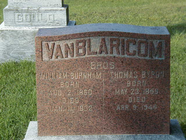 Thomas "Byron" Van Blaricom was born on 23 May 1859 at Percy Twp., Norham, Northumberland Co., Canada West; Date May 23 1859 per Memorial.1 He appeared on the census of April 1881 at Cramahe Twp., Ontario; Age 22 at 1881 Census: see Giles Van Blaricom.2 He appeared on the census of April 1891 at Cramahe Twp., Ontario; Age 32 at 1891 Census: Van blaricom, Byron, b. Ontario, Parents b. Ontario, Meth., farmer, single; ?Bernard?, 31, brother; Sarah, 24, sister.3 He died on 9 April 1946 at Morganston, Ontario, at age 86; Per Rootsweb. See Burial. He was buried on 12 April 1946 at Christian Church Cemetery, Morganston, Ontario; Memorial: (See Exhbit) Van Blaricom; Bros; William Burnham; Born; Aug 2 1860; Died Jan 11, 1932; Thomas Byron; Born; May 23, 1859; Died; Apr 9, 1946 (Cramahe Hill Cemetery, Morganston, Oct 29 2010)