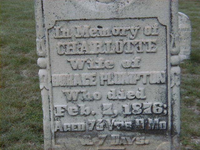 Cemetery Transcription: See Exhibit: In Memory of; Charlotte; Wife of; Horace Plumpton; Who died; Feb 3?, 1876; Aged 7? Yrs. 9? Mos; ? (McPhail's Cemetery, June 8, 2002)
