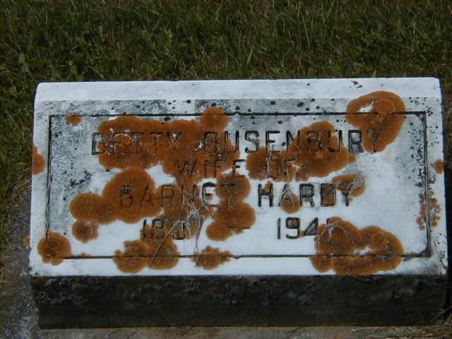 Betty Irene "Bessie" Dusenbury was born on 30 July 1897 at Brighton Twp., Codrington, Northumberland Co., Ontario; Date 1897 & location Ont. per 1921 Cecnsus. Date July 1897 & location Ont. per 1911 Census. Date July 30 1897 per 1901 Census. Date 1897 & location Brighton Twp. per marr. reg'n.4,5,3,6 She appeared on the census of 31 March 1901 at Brighton Twp., Codrington, Northumberland Co., Ontario; Age 3 at 1901 Census: see John J. Dusenbury.7 She appeared on the census of 12 June 1911 at Brighton Twp., Codrington, Northumberland Co., Ontario; Age 13 at 1911 Census: see John G. Dusenbury.5 She lived on 11 June 1919 at Brighton Twp., Codrington, Northumberland Co., Ontario; Witness at marriage of Albert A. Van Blaricom and Helen Dusenbury.3 She lived on 29 December 1920 at Cramahe Twp., Morganston, Northumberland Co., Ontario; Residence Morganston per marriage reg'n.3 As of 29 December 1920,her married name was Hardy.1 She married James Garnet Hardy, son of Frederick Alfred Hardy and Harriett Idella "Hattie" Davidson, on 29 December 1920 at Brighton Twp., Northumberland Co., Ontario; Marriage Reg'n.#020561: Groom: James Garnet Hardy; Age: 22; Res.: Morganston; Born: Cramahe Twp; Status: bachelor; Occ.: farmer; Rel.: Meth; Parents: Fred Hardy, b. Tyendinaga & Hattie Davidson; Bride: Bessie Irene Dusenbury; Age: 23; Res.: Morganston; Born: Brighton Twp; Status: spinster; Rel.: Meth; Parents: J. G. Dusenbury, b. Codrington & Mary Delaney; Expected Res.: Brighton Twp; Wit.: Myrtle M. Hardy, Morganston & Vern N. Ames, 55 Cedar Ave., Hamilton; Date: Dec 29 1920; Place: Brighton Twp; Performed by: W. s. Smart, Hilton, Meth; Sworn: Dec ? 1920; Reg'r.: ? Roblin, Brighton (Ontario Marriage Registration, #020561-1920, ancestry.com - stamped Jan 8 1921- ancestry.com) Date Dec 29 1926 per family tree of francesdarling_1 shared on ancestry.com Jan 17 2013, copied Jul 18 2014.2,8 Betty Irene "Bessie" Dusenbury appeared on the census of 1 June 1921 at Cramahe Twp., Northumberland Co., Ontario; Age 23 at 1921 Census: see Garnet Hardy.6 She "Just back from having spent a few hours with the 90 year old widow of a first cousin of my mother who knew all the details of a boy adopted by the Ames. His name was Fred Hardy Ames and he was the biological son of Garnet Hardy and Betty "Bessie" Dusenbury who also were the parents of Doris (Hardy) Darling and Helen (Doidge) Hardy. These girls were raised by their grandparents Harriet and Fred Hardy of Morganston, but the baby son was adopted by Betty Dusenbury's sister who was married to ? Ames who already had a son. Betty Dusenbury was incarcerated in the Whitby mental hospital as she suffered from severe postpartum neurosis and believed to be incurable. Fred Hardy Ames had a more than passing relationship with his sisters throughout his life (now deceased) and was described to me today as a shy, somewhat withdrawn individual whom my contact believed to have been a photographer and lived in the Oshawa/Whitby area. Helen (widow of Jim Doidge) resides in a nursing home in Woodstock, and Doris (widow of John Darling) lives with her daughter Ann in Frankford/Stockdale. Hope this is some help!" per email from Garnet Allen, Aug 30 2014 circa 1935 at Cramahe Twp., Morganston, Northumberland Co., Ontario.9 She died in 1941 at Ontario; Date 1941 per Burial.1 She was buried in 1941 at Mount Hope Cemetery, Brighton, Northumberland Co., Ontario; Memorial: (See Exhibit) Betty Dusenbury; Wife of; Garnet Hardy; 1897 - 1941 (Mount Hope Cemetery, Brighton.)1