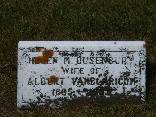 Date 1932?? b\per Burial. (not clear in picture - covered by moss.)3,7 She was buried on 6 December 1933 at Mount Hope Cemetery, Brighton, Northumberland Co., Ontario; Memorial: (See Exhibit) Helen M. Dusenbury; Wife of; Albert Vanblaricom; 1895 - 1933 (Mount Hope Cemetery, Brighton) per Death Reg'n.3,4