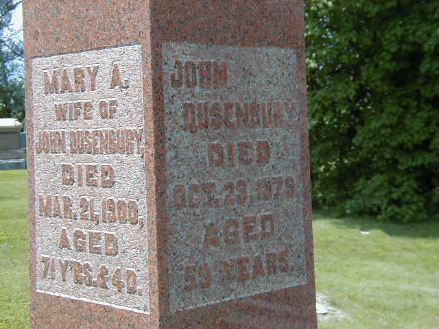 Note: No land mentioned ( - - ) but right below Conc 6, Lot 8 - John Morrow, James Cumming, Joseph Wheeler. He married Mary Ann Coffey before 1850 at Northumberland Co., Ontario. John James Dusenbury appeared on the census of April 1861 at Brighton Twp., Northumberland Co., Ontario; Age 39 at 1861 Census: Dusenbury, John, 39, b. Canada, farmer, C. of e., married; Mary, 32, married; Lucretia, 11, Elicia, 9; Ellen, 7; John, 5; Benjamin, 2.4 He lived in April 1871 at Conc 8 Lot 7, Brighton Twp., Northumberland Co., Ontario; Residence per 1971 Census: Conc 8, Lot 7, owner, 52 acres. He appeared on the census of April 1871 at Brighton Twp., Northumberlanc Co., Ontario; Age 50 at 1871 Census: Dusenbury, John, 50, b. Ont., C. of E., German, farmer, married; Mary Ann, 44, b. Ireland, Irish, married; Lucretia, 21, b. Ontarion, German; Alicia, 19; Ellen, 17; John Garnett, 15; Francis Benjamin, 13; Daniel James, 7; Rosa Isabella, 5; Bernard, 4; Freman Young, 10 months (June.)5 He died on 23 October 1879 at Brighton Twp., Northumberland Co., Ontario; Date Oct 23 1879 per Burial.2 He was buried on 25 October 1879 at Mount Hope Cemetery, Brighton, Northumberland Co., Ontario; Memorial: (See Exhibit) John; Dusenbury; Died; Oct 23 1879; Aged; 59 Years; Mary A; Wife of; John; Dusenbury; Died; March 21 1900; Aged; 71 Yr's & 4 D's (Mount Hope Cemetery, Brighton.)2