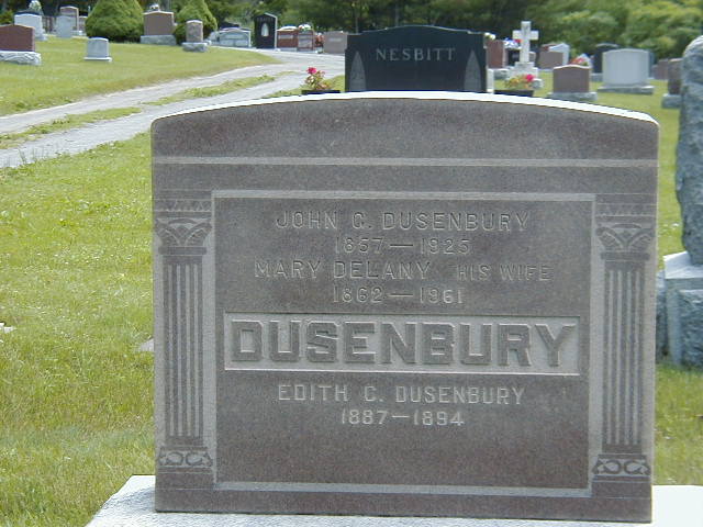 Mary Eliza Delaney was born on 6 October 1862 at Murray Twp., Northumberland Co., Canada West; Date Oct 1862 & location Ont. per 1911 Census. Date Oct 6 1862 & location Ont. rural per 1901 Census. Date 1862 & location Ont. per 1871 Census. Date 1862 per Burial.1,2,4,5 She appeared on the census of April 1871 at Brighton Twp., Northumberland Co., Ontario; Age 9 at 1871 Census: see Andrew Delaney.5 She lived on 12 January 1887 at Brighton Twp., Northumberland Co., Ontario; Reisdence Brighton Twp. per marr. reg'n.3 As of 12 January 1887,her married name was Dusenbury. She married John Garnett Dusenbury, son of John James Dusenbury and Mary Ann Coffey, on 12 January 1887 at Percy Twp., Hastings, Northumberland Co., Ontario; Marriage Reg'n.#008739: Groom: John G. Dusenbury; Age: 28; Res.: Brighton Twp; Born: Cda; Status: bachelor; Occ.: farmer; Parents: John James & Mary Ann Dusenbury; Bride: Mary Eliza Delaney; Age: 23; Res.: Brighton Twp; Born: Cda; Status: spinster; Parents: Andrew P. & Sophia Delaney; Wit.: Thomas Henry, ?Hudson? Township & E. A. "Limbert?, Hastings; Date: Jan 12 1887; Place: Hastings; Rel.: CE & Meth; Performed by: Rev. W. Limbert, Hastings (Ontario Marriage Registration, #008739-1887, ancestry.com.)6 Mary Eliza Delaney appeared on the census of April 1891 at Brighton Twp., Northumberland Co., Ontario; Age 28 at 1891 Census: see John Dusenbury.7 She appeared on the census of 31 March 1901 at Brighton Twp., Codrington, Northumberland Co., Ontario; Age 38 at 1901 Census: see John G. Dusenbury.8 She appeared on the census of 12 June 1911 at Brighton Twp., Codrington, Northumberland Co., Ontario; Age 48 at 1911 Census: see John G. Dusenbury.4 She died in 1961 at Ontario; Date 1961 per Burial.2 She was buried in 1961 at Mount Hope Cemetery, Brighton, Northumberland Co., Ontario; Memorial: (See Exhibit) John G. Dusenbury; 1857 - 1925; Mary Delany His Wife; 1862 1961; DUSENBURY; Edith C. Dusenbury; 1887 - 1894 (Mount Hope Cemetery, Brighton.)2