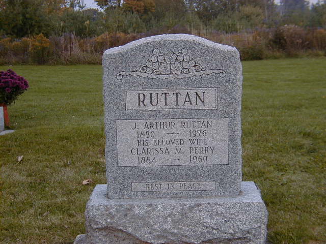 Clarissa M. "Clara" Perry was born on 30 October 1884 at Brighton Twp., Northumberland Co., Ontario; Date Oct 1884 & location Ont. per 1911 Census. Date Oct 30 1884 & location Ont. rural per 1901 Census. Date 1884 & location Brighton Twp. per marr. reg'n.2,1,3 She appeared on the census of April 1901 at Brighton Twp., Northumberland Co., Ontario; Age 16 at 1901 Census: see Byron Perry.4 She lived on 28 December 1904 at Brighton Twp., Northumberland Co., Ontario; Residence Brighton Twp. per marr. reg'n.1 As of 28 December 1904,her married name was Ruttan. She married James Arthur "Dick" Ruttan, son of William Martin "Mart" Ruttan and Amanda Melissa "Mandy" Maybee, on 28 December 1904 at Hastings Co., Ontario; Marriage Reg'n.#009583: Groom: Arthur J. Ruttan; Age: 24; Res. & Born: Murray Twp; Status: bachelor; Occ.: farmer; Parents: Martin Ruttan & Amanda Mayby; Bride: Clara M. Perry; Age: 20; Res. & Born: Brighton Twp; Status: spinster; Parents: Byron Perry & Ida Griffith... pg. 2 n/a ... Date: Dec 28 1904 (Ontario Marriage Registration, #009583-1904, ancestry.com.)5 Clarissa M. "Clara" Perry appeared on the census of 1911 at Murray Twp., Wooler, Northumberland Co., Ontario; Age 26 at 1911 Census: see Arthur Ruttan.3 She " ... Mr. and Mrs. Arthur Ruttan ... 50th Wedding Anniversary ... " Brighton Ensign, Dec 28, 1954 on 16 December 1954 at Wooler, Northumberland Co., Ontario.6 She died in 1960 at Wooler, Northumberland Co., Ontario; Date 1960 per Burial.7 She was buried in 1960 at McPhail's Cemetery, Brighton Twp., Northumberland Co., Ontario; Memorial: (See Exhibit) Ruttan; J. Arthur Ruttan; 1880 - 1976; His Beloved Wife; Clarisa M. Perry; 1884 - 1960.7