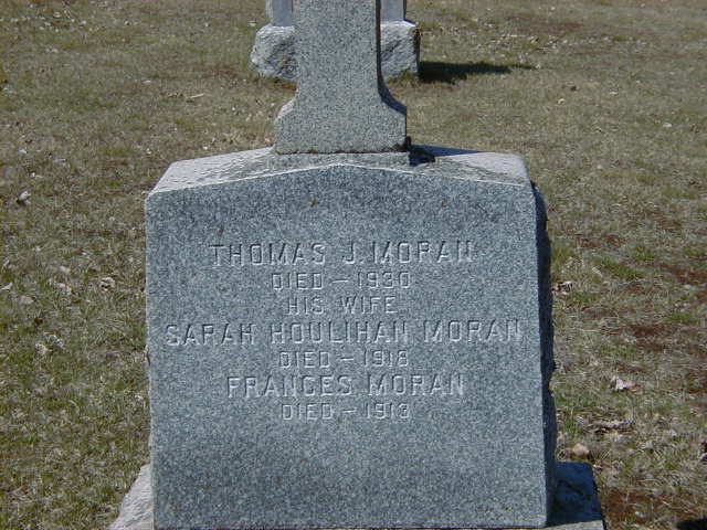 per 1901 Census.3,10 Thomas Joseph Moran appeared on the census of April 1901 at Brighton Twp., Northumberland Co., Ontario; Age 37 at 1901 Census: see John Moran.3 He appeared on the census of 8 June 1911 at Brighton Twp., Codrington, Northumberland Co., Ontario; Age 47 at 1911 Census: Moran, Thomas, 47, b. Ont. Nov 1863, Irish, R.C., farmer, married; Sarah, 41, b. Ont. Apr 1870, Irish, R.C., married; Mary, 13, b. Ont. Sep 1897, daughter; Frances, 11, b. Ont. Mar 1899, daughter; William, 6, b. Ont. Oct 1904, son; Vncent, 4, b. Ont. Jan 1906, son; Jerald, 3, b. Ont. Jul 1907, son (1911 Census: Brighton Twp., dist. 101, sub-dist. 17, pg. 6, line 19 - Conc 7, Lot 36, W 1/2.)4 He lived on 8 June 1911 at Brighton Twp., Codrington, Northumberland Co., Ontario; Residence per 1911 Census: Conc 7, Lot 36, West Half, Brighton Twp.4 He died on 27 March 1930 at Brighton Twp., Northumberland Co., Ontario, at age 66; Death Reg'n.#026571: Name: Thomas Joseph Moran; Date: Mar 27 1930; Age: 67y 4m 10d; Res. & Born: Brighton Twp; Born: Nov 17 1863; Occ.: farmer; Status: widower; Res. at place of death: 57 yrs; Parents: John Moran, b. Ireland & Anna O'Halloran, b. Ireland; Inf.: Vincent J. Moran, Codrington, son; Burial: Codrington R.C. Cemetery, Mar 29 1930; Und.: B. Buchanan, Warkworth; Reg'r.: Fred Wade; Reg'd.: Mar 29 1930 (Ontario Death Registration, #026571-1930, ancestry.com.)11 He was buried on 29 March 1930 at Codrington Catholic Cemetery, Northumberland Co., Ontario; Memorial: (See Exhibit) Thomas J. Moran; Died 1930; His Wife; Sarah Houlihan Moran; Died 1918; Frances Moran; Died 1913 (Codrington Catholic Cemetery, Brighton Twp., Apr 6, 2007.)12