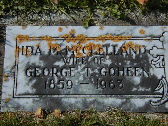 CEMSearch: Name: Ida M. Goheen; Maiden: McLelland; Born: 1859; Died: 1963; Notes: Wife of George T. Goheen; Buried: Stone Cemetery, Percy Twp; No other names.2,4