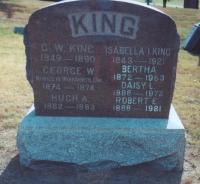 Hugh Allen King was born on 26 October 1882 at Solomon, Kansas, U.S.A; Date & location per Mildred (King) Beitzel's family history. Per Family Group Sheet from Kansas. Twins? (on same sheet.) He died on 28 February 1883 at Solomon, Kansas, U.S.A.. He was buried on 1 March 1883 at Prairie Mound Cemetery, Solomon, Dickinson Co., Kansas, U.S.A; Memorial: (See Exhibit) KING; G. W. King; 1849 - 1890; Isabella I. King; 1843 - 1921; George W; Buried in Warkworth, Ont; 1874 - 1874; Bertha; 1872 - 1963; Hugh A; 1882 - 1883; Daisy L; 1888 - 1972; Robert E; 1888 - 1981 (Prairie Mound Cemetery, Solomon City, Kansas, sent to me by Kay, 2003) Per Family Group Sheet from Kansas.1
