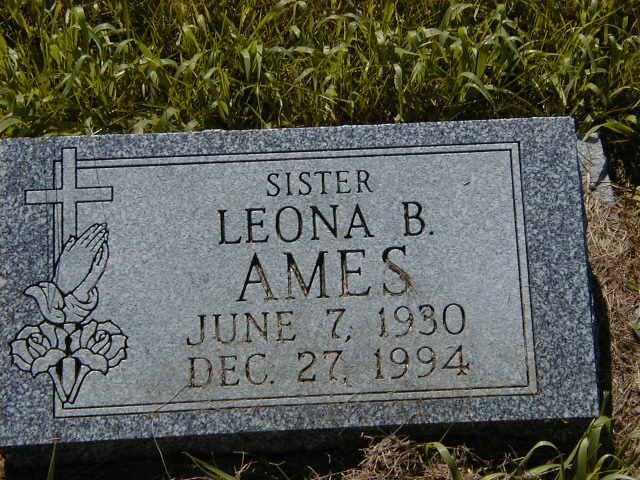 Note: Tobarmore School was on the main highway just at the bottom of the gravel road the Ames' lived on. There is a cairn for it on the south east corner of the intersection. (July 14, 2005) in August 1940 at Tobarmore School, Birnie, Manitoba.2 She died on 27 December 1994 at Manitoba at age 64; Date Dec 27 1994 per Burial.1 She was buried on 30 December 1994 at Birnie Cemetery, Birnie, Manitoba; Memorial: (See Exhibit) Sistger; Leona B; Ames; June 7 1930; Dec 27 1994 (Birnie Cemetery, Birnie, Manitoba, July 14, 2005.)1