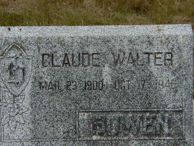 Date per Cemetery Transcription. 1898 per 1901 Census. Year 1900 per Carolyn O'Neil's Doc. Per Carolyn O'Neil's Ames/Bowen Doc, from Boyd Ames, New Liskeard, July 20, 2001.2 He appeared on the census of April 1901 at Dymond & Hudosn Twp., Nipissing District, Ontario; Age 1 at 1901 Census: see Walter Bowen.3 He appeared on the census of 1911 at Dymond Twp., Timiskaming Dist., Ontario; Age 11 at 1911 Census: see Walter Bowen.4 He married Mae Lisa Glasford after 1920 at Ontario. Claude Walter Bowen "Hudson: Mrs. Walter Bowen is spending a few days in town with Mr. and Mrs. Claude Bowen." from The New Liskeard Speaker, January 26, 1933, seen on microfilm at The Ontario Archives, March 1, 2001 on 26 January 1933 at Hudson Twp., Ontario. He lived on 27 August 1936 at Hudson Twp., Timiskaming District, Ontario; Voters List 1936: Conc: 4, Lot 7, Pt N 1/2; Bowen, Claud, - ; Owner; Elk Lake P.O; ME (Voters List of Hudson Twp., August 27, 1936, from Appendix B-3 of I've got to stop here until I'm called for: Chronicles of Hudson Township.) He died on 17 October 1946 at New Liskeard, Timiskaming District, Ontario, at age 46; Date per Carlyn O'Neil's tree. Per Carolyn O'Neil's Ames/Bowen Doc, from Boyd Ames, New Liskeard, July 20, 2001. He was buried on 20 October 1946 at New Liskeard Cemetery, New Liskeard, Timiskaming District, Ontario; Memorial: (See Exhibit) Claude Walter Bowen; Mar 23 1900 - Oct. 17 1946 (Pioneer Cemetery, New Liskeard, July 1, 2005)