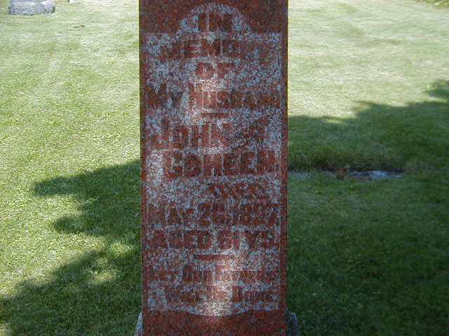 John Goheen was born on 16 December 1836 at Hamilton Twp., Northumberland Co., Upper Canada; Per Alan E. Richards GEDCOM. He married Mary Ann Cuthbert before April 1861 at Hamilton Twp., Northumberland Co., Canada West; They are together with no children at the 1861 Census. John Goheen appeared on the census of April 1861 at Hamilton Twp., Northumberland Co., Canada West; Age 27 at 1861 Census: Goheen, John, 27, b. U.C., W.M., farmer, married; Mary A., 25, b. U.C., W.M., married.1 He married Margaret Goheen, daughter of Henry Goheen and Ann Lyttle, after 1869 at Northumberland Co., Ontario. John Goheen appeared on the census of April 1881 at Port Hope, Durham East Co., Ontario; Age 43 at 1881 Census: Goheen, John, 43, b. Ont., Irish, CM, Capenter, married; Margaret, 30, b. Ont., Irish, married; Adith, 17; Georgina, 16; Mary A., 13; William F., 10; Moude R. M., 4 (familysearch.org.)2 He died on 26 May 1897 at Hamilton Twp., Northumberland Co., Ontario, at age 60; Date May 26 1897 per Memorial. Per Burial. Per Alan E. Richards GEDCOM.3 He was buried on 28 May 1897 at Bethel Grove Cemetery, Hamilton Twp., Northumberland Co., Ontario; Memorial: (See Exhibit) In; Memory; Of; My Husband; John; Goheen; Died; May 26 1897; Aged 61 Years (Bethel Grove Cemetery, Hamilton Twp., July 15, 2006)