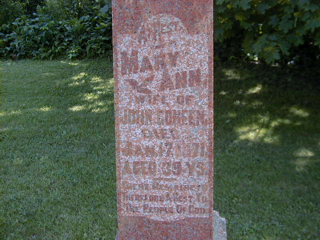 Mary Ann Cuthbert was born in 1832; Date 1832 Memorial. Per Alan E. Richards GEDCOM.1 She married John Goheen, son of Israel Goheen and Elizabeth "Betsy" Scott, before April 1861 at Hamilton Twp., Northumberland Co., Canada West; They are together with no children at the 1861 Census. As of before 1862,her married name was Goheen. Mary Ann Cuthbert died on 17 January 1871 at Hamilton Twp., Northumberland Co., Ontario; Date Jan 17 1871 per Memorial. Per Alan E. Richards GEDCOM.1 She was buried on 19 July 1871 at Bethel Grove Cemetery, Hamilton Twp., Northumberland Co., Ontario; Memorial: (See Exhibit) Mary Ann; Wife of; John Goheen; Died; Jan 17 1871; Aged 39 Yrs (Bethel Grove Cemetery, Hamilton Twp., July 15, 2006)