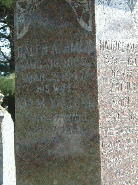 CEMSearch shows: Ralph A. Ames, Born: 1865-08-30, Died: 1947-03-02, Age: 81y 6m 2d, Husband of Ida M. Valleau, Mount Olivet Cemetery, Other names: see Gertrude Ames.7,17