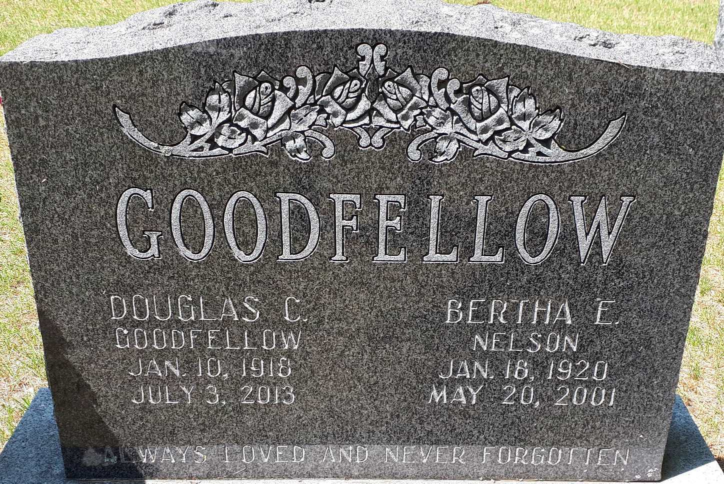 Note: At this point (July 2009) there is no date on the pictures I have for Bertha's death.1 She was buried on 20 May 2001 at Mount Olivet Cemetery, Brighton Twp., Northumberland Co., Ontario; Memorial: (see Exhibit) GOODFELLOW; Douglas C; Goodfellow; Jan. 10, 1918; July 3, 2013; Bertha E; Nelson; Jan. 18, 1920; May 20, 2001 (Mount Olivet Cemetery, Brighton Township, Sep 26 2019.)2,1