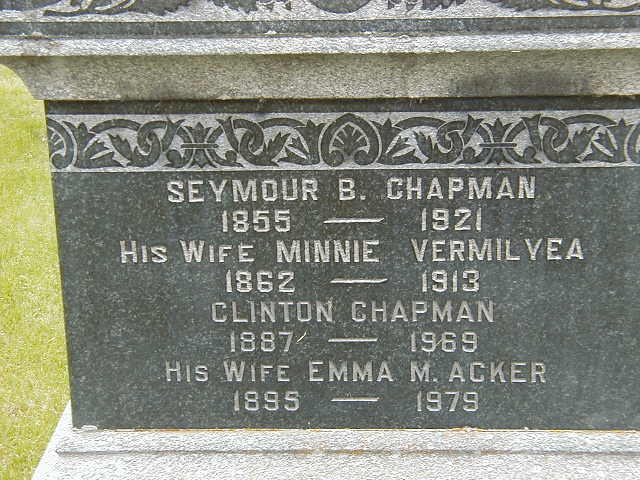 Seymour B. Chapman was born on 26 June 1855; Date Jun 26 1855 per 1901 Census. Date 1855 per Burial. Per death notice of daughter Mabel Jane (Chapman) Striker.1,3 He appeared on the census of April 1881 at Murray Twp., Northumberland Co., Ontario; Age 26 at 1881 Census: see Jeremiah Chapman.2 He married Mary A. "Minnie" Vermilyea before 1886. Seymour B. Chapman appeared on the census of April 1901 at Murray Twp., Northumberland Co., Ontario; Age 45 at 1901 Census: Chapman, Lamour?, 45, b. Jun 26 1855, head, married; Mary A., 39, b. Feb 11 1862, Wife, married; Clinton, 13, b. May 15 1887, son; Earl D., 12, b. Feb 9 1889, son; Jettina, 10, b. Aug 30 1890, daughter; Jennie M., 7, b. Apr 1 1894, daughter; Jerald, 5, b. Aug 17 1895, son; Golden, Fred, 43, b. Jun 26 1858, domestic, single (1901 Census Index Online: dist 95, g-4, pg. 9, line 19, T-6485.)3 He died in 1921 at Ontario; Date 1921 per Burial.1 He was buried in 1921 at Frankford Cemetery, Frankford, Hastings Co., Ontario; Memorial: (See Exhibit) Seymour B. Chapman; 1855 - 1921; His Wife Minnie Vermilyea; 1862 - 1913; Clinton Chapman; 1887 - 1968; His Wife Emma M. Acker (Frankford Cemetery, May 22, 2005.)1