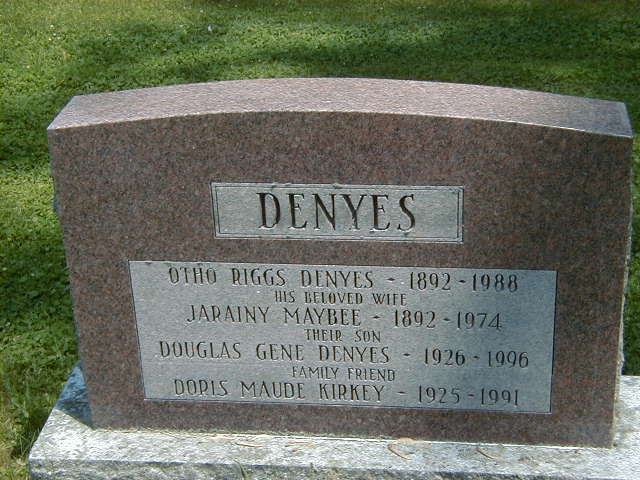 Otho Riggs Denyes was born on 16 December 1892; DAte Dec 16 1891 per Doug Maybee email, June 27, 2001. Date 1892 per Memorial.1,2 He married Jarainy Maybee, daughter of David Edward Maybee and Mary Jarainy Way, on 16 April 1919; Per Doug Maybee email, June 27, 2001. Otho Riggs Denyes was buried in 1988 at Belleville Cemetery, Belleville, Hastings Co., Ontario; Memorial: (See Exhibit) DENYES; Otho Riggs Denyes - 1892 - 1988; His Beloved Wife; Jarainy Maybee - 1892 - 1974; Their Son; Douglas Gene Denyes - 1926 - 1996; Family Friend; Doris Maude Kirkey - 1925 - 1991 (Belleville Cemetrey, Belleville, June 22, 2006.)1 He died in 1988 at Ontario; Date 1988 per Memorial.1