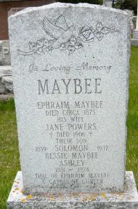 Jane Powers was born on 22 October 1820 at Ireland; Date Oct 22 1821 & location Ireland per 1901 Census. Date 1820 & location Ireland per 1881 Census. Date 1827 & location Ireland per GEDCOM of Don & Jeanne Ross, May 31, 2003. IGI Record.1,2,3,4 As of after 1852,her married name was Maybee. She married Ephraim Maybee, son of Peter Maybee and Catherine Huff, after 1852 at Upper Canada; Bessie is dau. of Ephraim Maybee and Catherine Gunter per Memorial & FindaGrave.5,6 Jane Powers appeared on the census of April 1881 at Murray Twp., Northumberland Co., Ontario; Age 61 at 1881 Census: see Solomon Maybee (son.)3 She appeared on the census of 16 April 1901 at Brighton Twp., East Northumberland Co., Ontario; Age 79 at 1901 Census: see Solomon Maybee (son.)4 She was buried in 1906 at Stockdale Cemetery, Murray Twp., Northumberland Co., Ontario; Memorial: (See Exhibit) In Loving Memory of; MAYBEE; Ephraim Maybbe; Died Circa 1875; His Wife; Jane Powers; Died 1906; Thier Son; 1859 Solomon 1937; Bessie Maybee; Ashley; 1851 - 1924; Dau. of Ephraim Maybee; & Catherine Gunter (Stockdale Cemetery, Stockdale, image from FindaGrave.)5,6 She died in 1906; Date 1906 per Memorial & FindaGrave.5,6