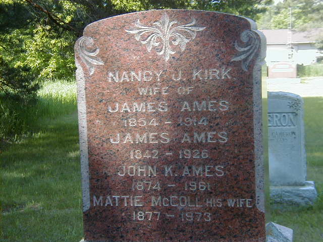 "Mattie Ames; Died Oct 4, 1973; Age 97; Oct 5, 1973; Page 2; Brighton Ensign."8 She was buried on 7 October 1973 at Mount Olivet Cemetery, Brighton Twp., Northumberland Co., Ontario; CEMSearch shows: Mattie Ames, Maiden: McColl, Born: 1877, Died: 1973, Age: 96y, Wife of John K. Ames, Mount Olivet Cemetery, Other names: James Ames, John K. Ames, Nancy J. Ames.