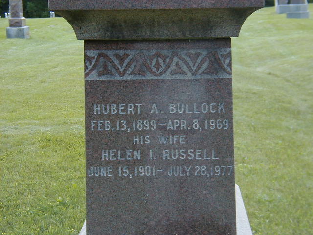 Hellen Isabela Russell was born on 15 June 1901 at Brighton Twp., Northumberland Co., Ontario; Birth Reg'n.# : Name: Hellen Isabella Russell; Date: Jun 15 1901; Parents: W. Henry Russell & Ada Luella Ames... no 2nd page ... (Ontario Birth Registration, #... , ancestrty.com) Date June 15, 1901 per Memorial. Date Jun 1899 & location Ont. per 1911 Census.3,4,2 She appeared on the census of 1911 at Addison St., Brighton, Northumberland Co., Ontario; Age 10 at 1911 Census: see William Henry Russell.4 As of 23 June 1920,her married name was Bullock. She married Hubert Arthur Bullock, son of Arthur David Bullock and Eva Prindle Beach, on 23 June 1920 at Brighton, Northumberland Co., Ontario; Marriage Reg'n.#020444: Groom: Hubert Arthur Bullock; Age: 21; Res. & Born: Brighton; Status: bachelor; Occ.: Merchant; Rel.: CE; Parents: Arthur David Bullock, b. Brighton & Eva Beech;; Bride: Helen Isabel Russell; Age: 19; Res. & Born: Brighton; Status: spinster; Rel.: Meth; Parents: Wm Henry Russell, b. Brighton & Ada Ames; Expected Res.: Brighton; Wit.: Morley R. Simpson & Nora E. Snelgrove, Brighton; Date: Jun 23 1920; Place: Brighton; Performed by: W. R. Archer, Brighton, Meth; Sworn: Brighton, Jun 18 1920; Reg'r.: W. W. Porte, Brighton (Ontario Marriage Registration, #020444-1920, ancestry.com) "Hurbert Arthur Bullock, married June 23, 1920, Helen Isabel Russell; June 25, 1920 & July 2, 1920; Brighton Ensign."5,6 Hellen Isabela Russell lived on 21 February 1930 at Brighton, Northumberland Co., Ontario; Per Death Notice of father William Henry Russell. She lived on 2 May 1957 at Lot 8a, 22 Bayshore Rd., Presqu'ile Point, Northumberland Co., Ontario; Land Registry Records (Quit Claim Grant 22279) show that Dorothy B. Hall (formerly Denson) granted "part of Lot 8a, intended to be the land in 12295", Lot 8a, Bayshore Rd., Presqu'ile Point, Northumberland Co. to Helen J. Bullock for $3,600), ITS Date: May 2 1957. Reg'n. Date: Feb 20 1959. (Ontario Land Registry Records, Northumberland Co., Brighton Village, Book 013, pg. 139 of 198, OnLand.ca)