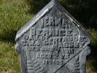 Date 1908 & location Ont. per 1911 Census. Per Burial. Died 2 years old.1,2 She appeared on the census of 1911 at Cramahe Twp., Northumberland Co., Ontario; Age 3 at 1911 Census: see Clarence Massey.1 She died on 7 June 1911 at Cramahe Twp., Northumberland Co., Ontario, at age 2; Date Jun 7 1911 per CEMSearch. Per Burial. Died 2 years old.3 She was buried on 9 June 1911 at Stone Cemetery, Percy Twp., Northumberland Co., Ontario; Memorial: (See Exhibit )Verna; Bernice; Dau. of; C. W. & Gertrude; Massey; Died June 7 1911; Aged 2 Ys; 11 Mos (Stone's Cemetery, Percy Twp., June 25 2007)
