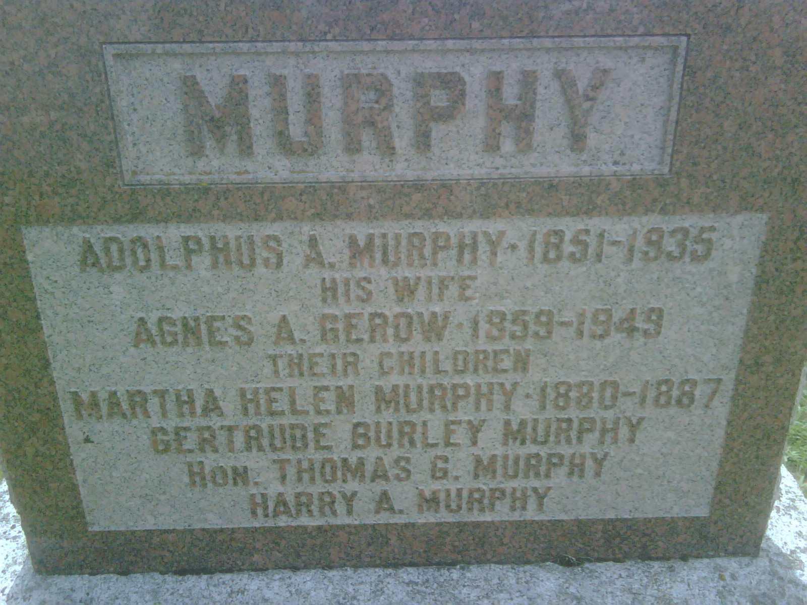 Martha Helen Murphy was born on 4 July 1880 at Cramahe Twp., Dundonald, Northumberland Co., Ontario; Per "John Lawson Gerow" from George Gerow, August 19, 2001. She died on 18 January 1887 at Cramahe Twp., Dundonald, Northumberland Co., Ontario, at age 6; Per "John Lawson Gerow" from George Gerow, August 19, 2001. She was buried on 20 January 1887 at Salem Cemetery, Salem, Northumberland Co., Ontario; Memorial: (See Exhibit) MURPHY; Adolphus A. Murphy 1851-1935; His Wife; Agnes A. Gerow 1859-1949; Their Children; Marth Helen Murphy 1880-1887; Gertrude Burley Murphy; Hon. Thomas G. Murphy; Harry A. Murphy (Salem Cemetery, July 6 2009.)1