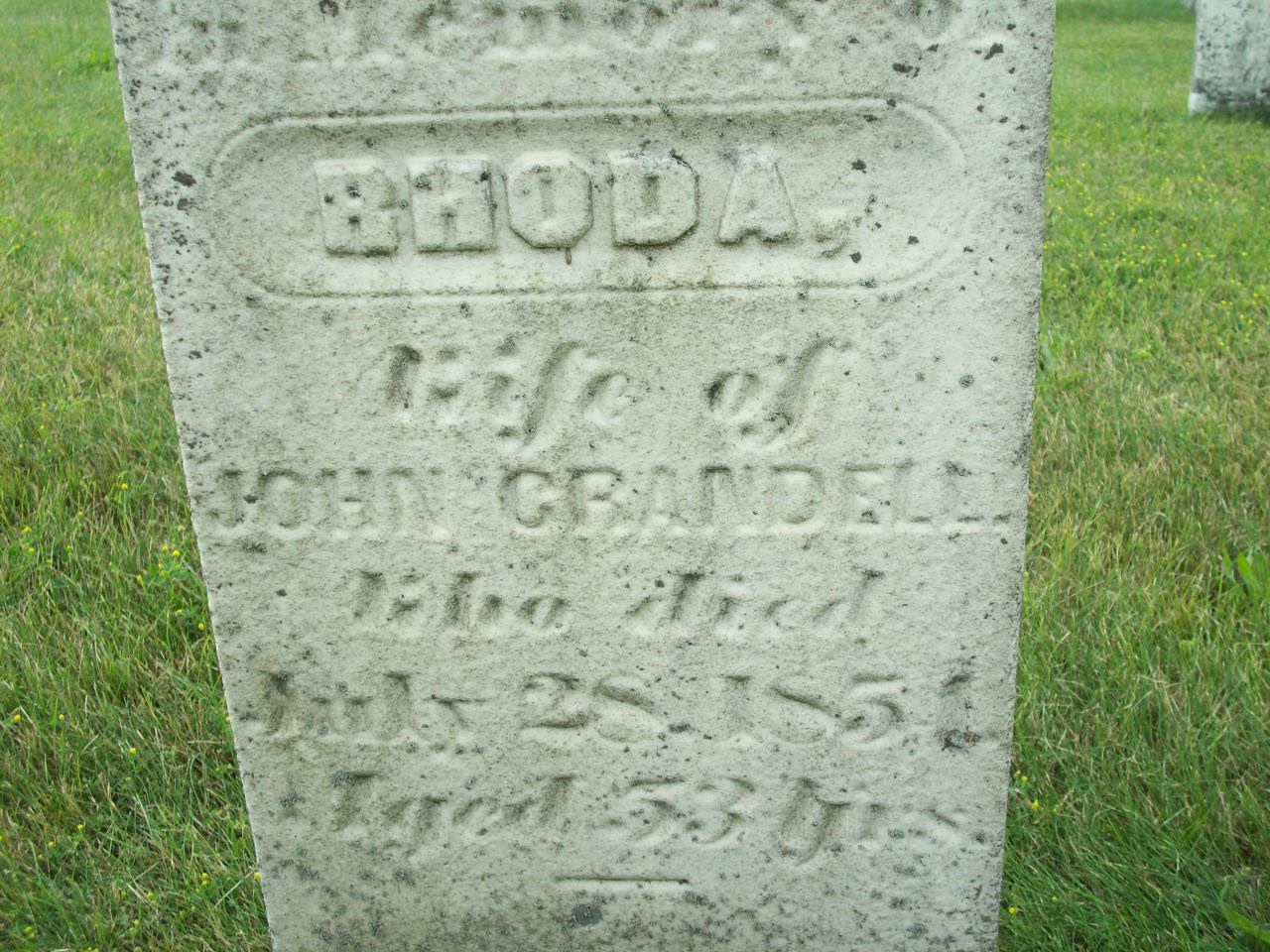 Rhoda Wood was born on 3 October 1801 at Upper Canada; Date Oct 3 1801 per family tree of Tonya Christman on ancestry.ca, Nov 24 2021. Date Oct 3 1801 per IGI Record. Per Larry Mill's GEDCOM. The first mention of Jeremiah Wood in Cramahe Twp. is 1812.1,2 As of before 1819,her married name was Crandell. She married John Vincent Crandell Sr., son of Palmer Crandell and Deborah Palmer, before 1819 at Northumberland Co., Upper Canada. Rhoda Wood appeared on the census of 1852 at Cramahe Twp., Northumberland Co., Canada West; Age 50 at 1851 Census: see John Crandell.3 She died on 28 July 1854 at Canada West at age 52; Date Jul 28 1854 per Burial. Date Jul 28 1854 per IGI Record.1,4 She was buried on 30 July 1854 at Salem Cemetery, Cramahe Twp., Salem, Northumberland Co., Canada West; Memorial: (See Exhibit) In Memory of; Rhoda; Wife of; John Crandell; Died; Jul 28 1854; Aged 53 Years (Salem Cemetery, June 5, 2005.)4