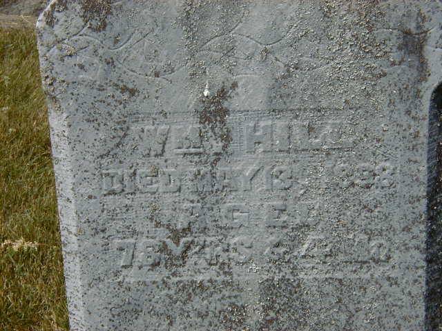Note this is not a sure thing. Daughters names were not known but all other issues match. Check William Hill history later for confirmation. William Hill died on 13 March 1898 at Percy Twp., Northumberland Co., Ontario; Death Reg'n.#010499: Name: William Hill; Date: Mar 13 1898; Age: 78; Res.: Conc 2, Lot 17, Percy Twp; Occ.: farmer; Born: USA; Cause: old age, 3 mo; Phys.: none; Rel.: Meth; Inf.: Jane A. Hill; Reg'd.: May 18 1898; Reg'r.: R. P. Hurlburt (Ontario Death Registration, #010499-1898, ancestry.com.)2