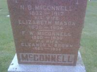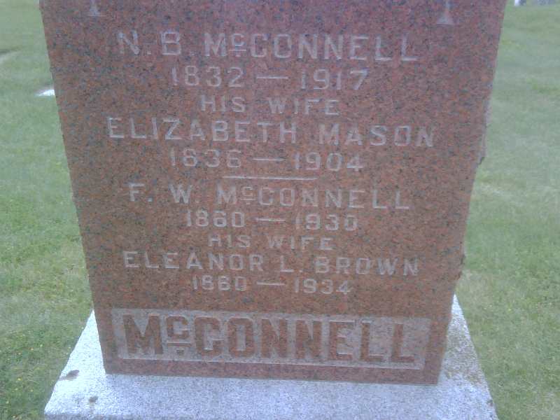 Cemetery Transcription: N. B. McConnell, 1832-1917; wife Elizabeth Mason, 1836-1904; F. W. Mcconnell, 1860-1930; wife Eleanor L. Brown, 1860-1934 (Ontario Archives)
