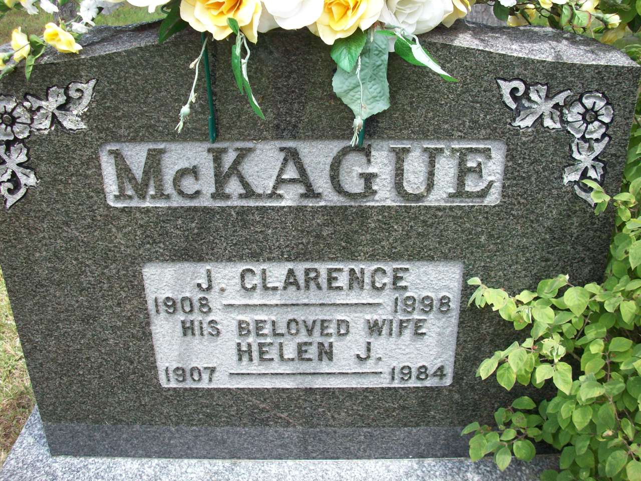 John Clarence McKague was born on 25 September 1908 at Conc 9 Lot 2, Cramahe Twp., Castleton, Northumberland Co., Ontario; Birth Reg'n.#034435: Name: John Clarence McKague; Date: Sep 25 1908; Parents: John Bruce McKague & Lena Maud McGregor; Inf.: John Bruce McKague, farmer, Castleton, Conc 9, Lot 2, Cramahe Twp; Phys.: Dr. Sargent; Reg'd.: Oct 25 1908; Reg'r.: C. A. Wilson, Cramahe Twp. (Ontario Birth Registration, #034435-1908, ancestry.com) Date 1908 per Memorial. History of Cramahe Twp., pg. 113.1,3 He married Helen Julia Runnells, daughter of William Thomas Runnells and Agnes Inglis, on 16 August 1933 at Ontario; Date Aug 16 1933 per family tree of sweetpearbear on ancestry.com, Feb 1 2010.4 John Clarence McKague died on 8 April 1998 at Cobourg, Northumberland Co., Ontario, at age 89; Date 1998 per Memorial. Date Apr 8 1998 & location Cobourg per family tree of sweetpearbear on ancestry.com, Feb 1 2010.1,4 He was buried on 11 April 1998 at Castleton Cemetery, Castleton, Northumberland Co., Ontario; Memorial: (See Exhibit) McKague; J. Clarence; 1908 - 1998; His Beloved Wife; Helen J; 1907 - 1984 (Castleton Cemetery, Castleton, Jul 15 2009.)1