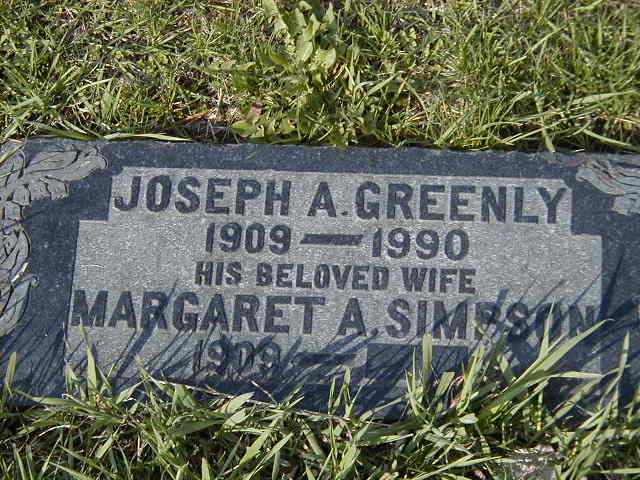 Joseph A. Greenly was born in 1909; Date 1909 per Burial. per History of Cramahe Twp., pg. 113.1 He was buried in 1990 at Warkworth Cemetery, Warkworth, Northumberland Co., Ontario; Memorial: (see Exhibit) Joseph A. Greenly; 1909 - 1990; Margaret A. Simpson; 1909 - (Warkworth Cemetery, May 1, 2003.)1 He died in 1990; Date 1990 per Burial.1