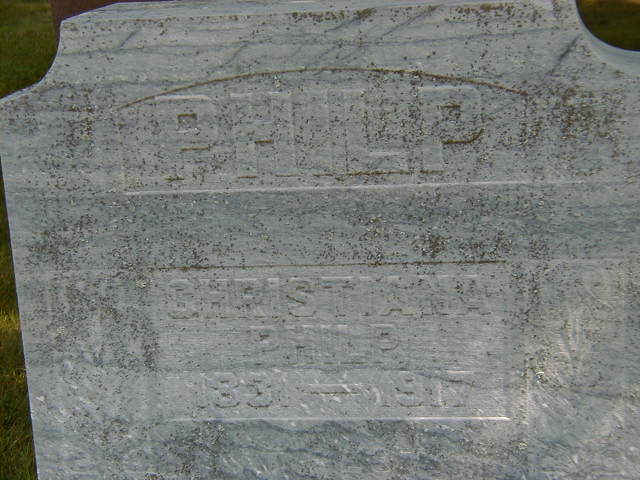 "The father (Great-grandfather Philp) died at the age of fifty, in 1841, two years after coming to Shiloh." from page 49 of "Ours To Remember" by Mary Ann Down, given to me by Shirley (Goodfellow) Bird Sep. 3, 2004.1,2,3 He was buried on 21 April 1841 at Shiloh Cemetery, Cramahe Twp., Shiloh, Northumberland Co., Ontario; Memorial: (See Exhibit) In Memory Of; John Philp; Died; Apr. 19, 1841; Aged; 49 Years (Shiloh Cemetery, Cramahe Twp., Sept. 4, 2004)
