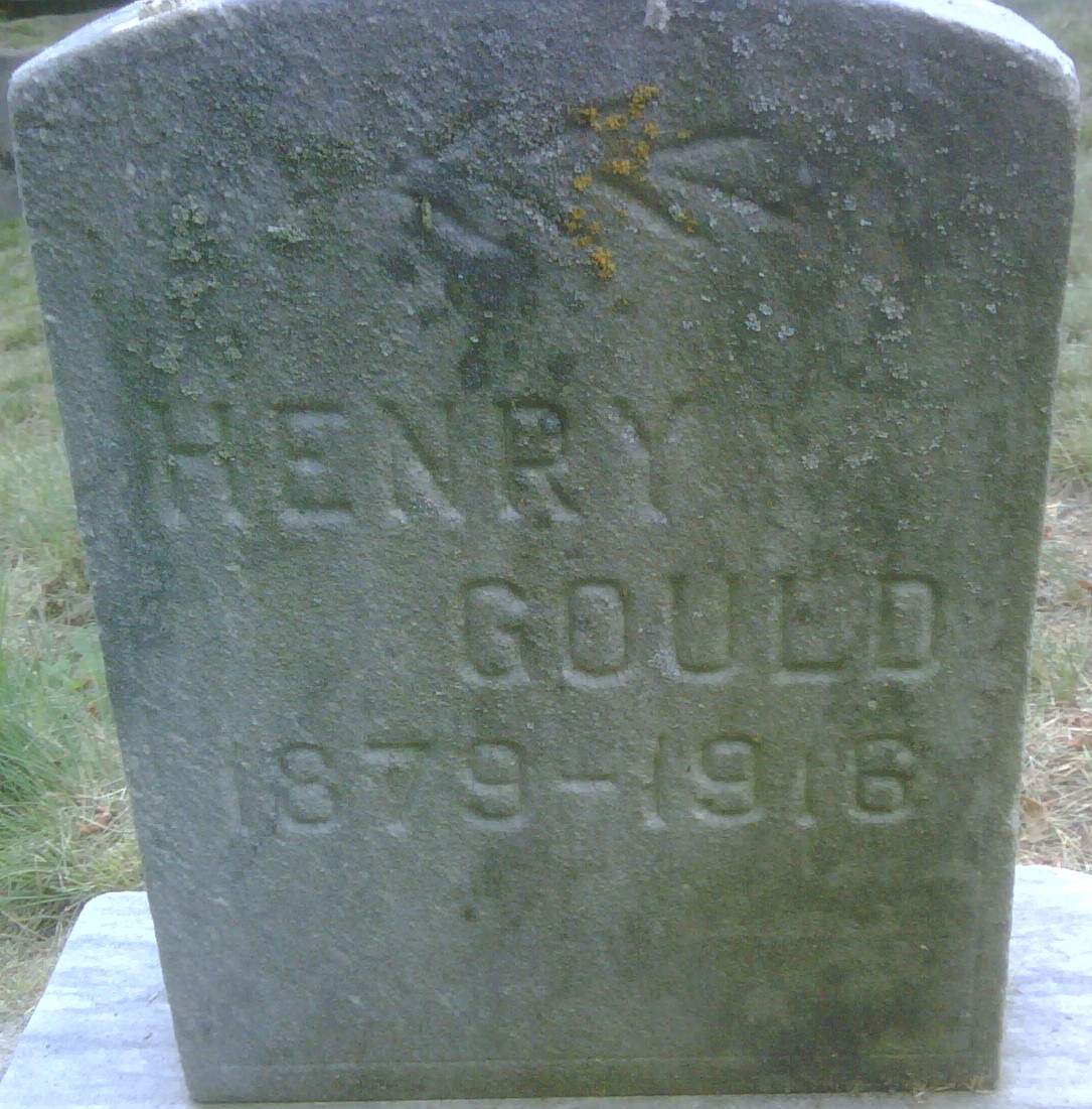 Date 1879 per Memorial. Location Cramahe Twp. per Death Reg'n. Date Mar 21 1880 & location Ont. per 1911 Census. Date Feb 24 1879 & location Ont. rural per 1901 Census. Date 1880 & location Ont. per 1891 Census. Date 1879 & location Ont. per 1881 Census.4,3,5,2,6,7 He appeared on the census of April 1881 at Brighton Twp., Northumberland Co., Ontario; Age 2 at 1881 Census: see Albert Gould.8 He appeared on the census of April 1891 at Cramahe Twp., Northumberland Co., Ontario; Age 11 at 1891 Census: see Albert Gould.9 He appeared on the census of April 1901 at Cramahe Twp., Northumberland Co., Ontario; Age 21 at 1901 Census: Gould, Henry, 21, b. Ont. Feb 24 1880, farmer, Domestic (under family of Benjamin & Margaret A. Perry (Page 1, Line 49: Conc 6, Lot 31.)10 He lived in April 1901 at Conc 6 Lot 31, Cramahe Twp., Northumberland Co., Ontario; Per 1901 Census: Conc 6, Lot 31, living with Benjamin & Margaret A. Perry & family. He married Alice May Hutchinson, daughter of Levi James Hutchinson and Mary Elizabeth Owens, on 13 January 1904 at Percy Twp., Northumberland Co., Ontario; Marriage Reg'n.#013735: Groom: Henry Albert Gould; Age: 24; Res. & Born: Brighton; Status: bachelor; Occupation: labourer; Parents: Albert Gould & Hannah Perry; Bride: Alice Hutchinson; Age: 21; Res.: Norham; Born: Warkworth; Status: spinster; Occupation: seamstress; Parents: Levi Hutchinson & Mary Owen; Witnesses: J. F. Wilson, Colborne & Edna Denike, Norham; Date: Jan 13, 1904; Place: Percy; Religion: Meth; Performed by: J. W. Shier (Ontario Marriage Registration, #013735-1904, ancestry.ca.)11 Henry Albert Gould appeared on the census of May 1911 at Conc 1 Lot 16, Percy Twp., Northumberland East Co., Ontario; Age 31 at 1911 Census: Gould, Henery, 31, b. Ont. Mar 21 1880, Eng., Meth., lab., married; Alice, 29, b. Ont. Apr 1 1882, Eng., Meth., married; Everett, 6, b. Ont. Nov 6 1905; Violet, 5, b. Ont. Apr 6 1906; Carman, 2, b. Ont. Nov 22 1909; Norman, 1/12, b. Ont. Apr 11 1911 (1911 Census: Percy Twp., Northumberland East Co., dist. 101, sub-dist. 26-1 (101-21), pg. 10, line 21 - Conc 1, part lot 16 - ancestry.ca.)2 He lived on 10 November 1915 at Warkworth, Ontario; "A family of three children are left to mourn the loss of a kind father, Carman of Peterborough, Henry of Warkworth and Mrs. Norman Montgomery of Brighton." from Obit of his father, Albert Gould. He died on 27 April 1916 at Percy Twp., Northumberland Co., Ontario, at age 37; Death Reg'n.#024565: Name: Henry Gould; Died: April 27, 1916; Age: 37y 2m 3d; Res.: Percy Twp; Born: Colborne; Buried: Percy Twp; Occupation: labourer; Status: married; Parents: Albert Gould & Hannah Perry; Cause: pneumonia; Dr.: J. A. Blizard; Inf.: George Hutchinson, Warkworth; Reg'd.: Apr 27, 1916; Reg'r.: P.S. Ewing, Percy Twp., Northumberland Co. (Ontario Death Registration, #024565-1916, ancestry.ca) Date 1916 per Memorial.12,3 He was buried on 29 April 1916 at Warkworth Cemetery, Warkworth, Northumberland Co., Ontario; Memorial: Henry; Gould; 1879-1916 (Warkworth Cemetery, Warkworth, image by Dan Buchanan, Jul 7 2009)
