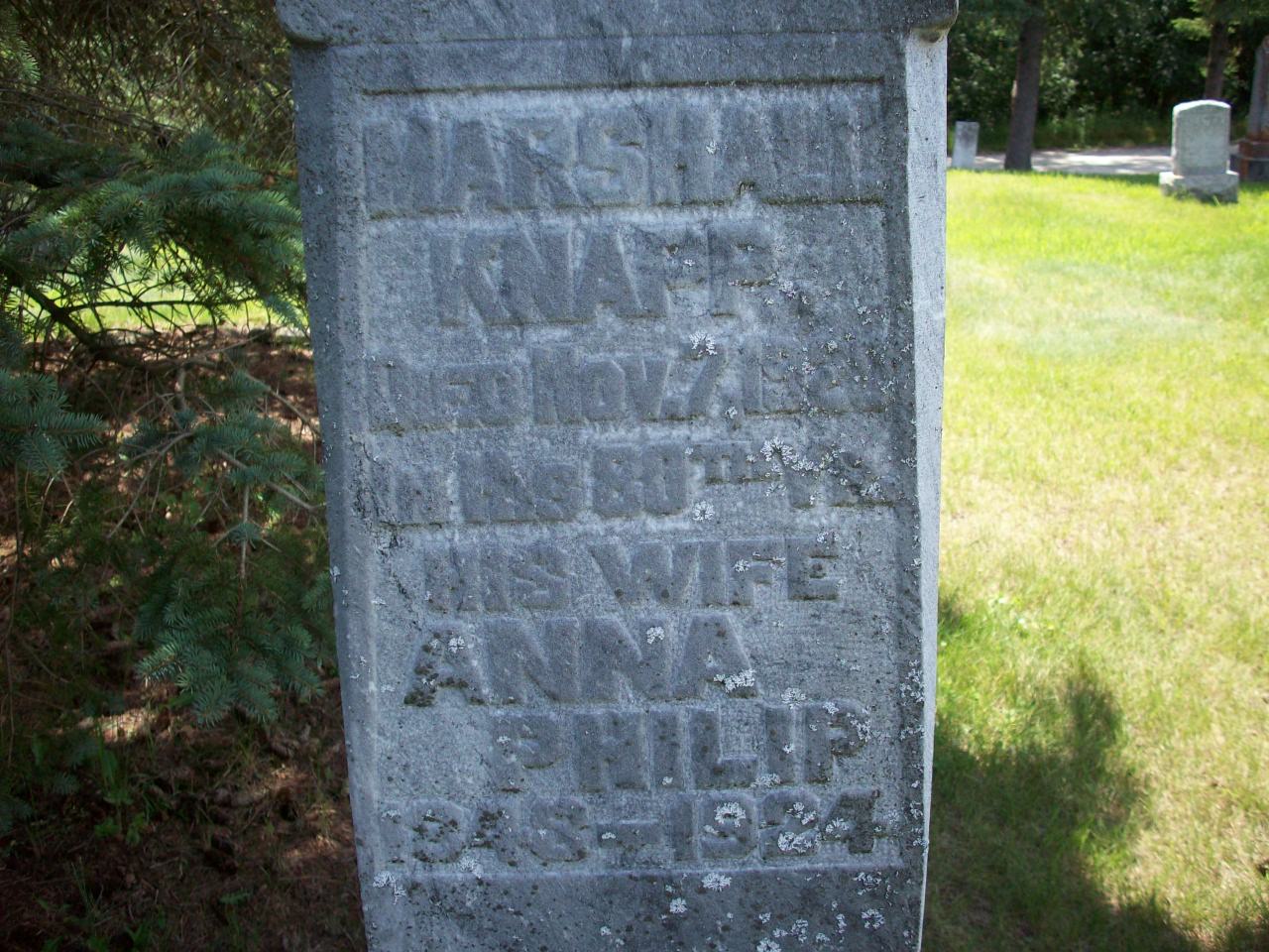 Anna Philp was born on 28 March 1846 at Cramahe Twp., Northumberland Co., Canada West; Date 1846 per Memorial. Date Mar 28 1844 & location Ont. rural per 1901 Census. Date 1844 & location Ont. per 1891 Census. Date 1844 & location Cramahe Twp. per marr. reg'n. Date Mar 28 1844 from page 50, "Ours To Remember", book by Mary Ann Down, Sep. 3, 2004. Per 1851 Census.2,3,4,1,5,6 She appeared on the census of 1852 at Cramahe Twp., Northumberland Co., Canada West; Age 7 at 1851 Census: see William Philp.7 She appeared on the census of April 1861 at Cramahe Twp., Northumberland Co., Canada West; Age 17 at 1861 Census: see William Philp.8 As of 25 December 1869,her married name was Knapp.2 She married Marshall Knapp, son of Alpheus Knapp and Elizabeth Carnwright, on 25 December 1869 at Cramahe Twp., Northumberland Co., Ontario; Marriage Reg'n.: Groom: Marshall Knapp; Age: 28; Res.: Cramahe Twp; Born: Prince Edward Co; Status: bachelor; Occ.: farmer; Parents: Alpheus & Elizabeth Knapp; Ann Philp; Age: 25; Res. & Born: Cramahe Twp; Status: spinster; Parents: William & Mary Ann Philp; Wit.: James Shannon & Christina Philp, Cramahe Twp; Date: Dec 25 1869; Place: Cramahe Twp; Rel.: W.M; Performed by: Rev. Geo. Robson (Ontario Marriage Registration, ancestry.com) Date Dec 25 1869 from page 50, "Ours To Remember", book by Mary Ann Down, Sep. 3, 2004. from page 53, "Ours To Remember", book by Mary Ann Down, Sep. 3, 2004.2,4 Anna Philp appeared on the census of April 1881 at Haldimand Twp., Northumberland Co., Ontario; Age 37 at 1881 Census: see Marshall Knapp.9 She appeared on the census of 17 April 1891 at Haldimand Twp., Northumberland West Co., Ontario; Age 47 at 1891 Census: see Marshall Knapp.5 She appeared on the census of 24 April 1901 at Haldimand Twp., Northumberland West Co., Ontario; Age 57 at 1901 Census: see Marshall Knapp.6 She lived on 7 November 1920 at Castleton, Northumberland Co., Ontario; Informant for Death Reg'n. of her husband Marshall Knapp.10 She died on 28 July 1924 at age 78; Date Jul 28 1924 from page 50, "Ours To Remember", book by Mary Ann Down, Sep. 3, 2004.2 She was buried on 30 July 1924 at Castleton Cemetery, Castleton, Northumberland Co., Ontario; Memorial: (See Exhibit) Marshall; Knapp; Died Nov. 7, 1920?; In his 80th Yr; His Wife; Anna Philp; 1846 - 1914 (Castleton Cemetery, Castleton, Jul 13 2009.)1