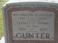 CEMSEarch: Name: Wellington B. Gunter; Born: 1855; Died: 1928; Notes: Son of Samuel Gunter and his second wife Jane Benson, first wife was Sarah Maybee, husband of (1) Nellie Weaver (2) Frances V. Adams; Buried: Stockdale Cemetery; Other names: Frances V. Gunter (Adams) (1860-1928.)2,3,8