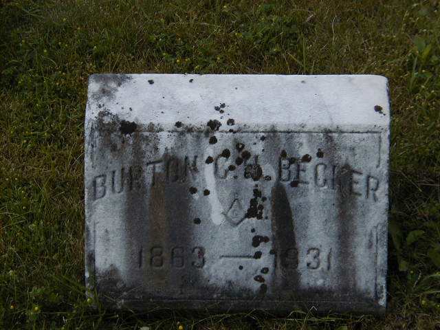Burton Cartier Henry Becker was born on 13 May 1863 at Belleville, Hastings Co., Canada West; Date 1863 per Memorial. Date May 13 1863 & location Ont. per Death Reg'n. Date May 13 1861 & location Belleville per Baptism Register. Date 1863 & location Ont. per 1921 Census. Date May 1863 & location Ont. per 1911 Census. Date May 13 1863 & location Ont. rural per 1901 Census. Date 1864 & location Ont. per 1891 Census. Date 1864 & location Ont. per 1881 Census.4,2,5,6,7,3,8,1 He was baptized on 26 July 1863 at Brighton, Northumberland Co., Canada West; Baptism: Name: Burton C. Henry Becker; Birth Date: 13 May 1861; Birth Place: Belleville; Baptism: Date: 26 Jul 1863; Baptism Place: Brighton; Father: A. A. Becker; Mother: R. Becker; Res.: Belleville (Wesleyan Methodist Baptism Register, ancestry.ca.)8 He appeared on the census of April 1871 at Brighton Twp., Northumberland Co., Ontario; Age 7 at 1871 Census: see Austin A. Becker.9 He appeared on the census of April 1881 at Brighton Twp., Northumberland Co., Ontario; Age 17 at 1881 Census: see Austin A. Becker.6 He lived on 3 March 1886 at Brighton Twp., Hilton, Northumberland Co., Ontario; Witness at marriage of Matthew Manley Edmonds and Ann L. Smith.10 He lived on 30 June 1887 at Brighton Twp., Hilton, Northumberland Co., Ontario; Witness at marriage of John Fulford & Sylvia J. Bate.10 He appeared on the census of April 1891 at Brighton Twp., Northumberland Co., Ontario; Age 27 at 1891 Census: see Austin Becker.5 He married Annie Maud "Martha" Valleau, daughter of Cornelius Valleau and Maranda Potter, on 3 August 1892 at Brighton, Northumberland Co., Ontario. Burton Cartier Henry Becker lived in 1899 at Conc 2 Lot 36, Brighton Twp., Northumberland Co., Ontario; "Becker, B C H, Brighton, f 2 36" Canada, City and Area Directories, 1899, Northumberland Co., Brighton Township, pg. 153 of 253, ancestry.ca.