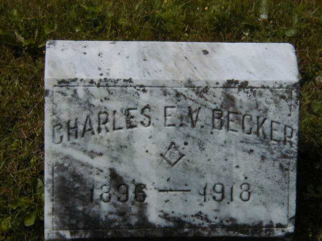 Charles Earle Valleau Becker was born on 14 April 1896 at Brighton, Northumberland Co., Ontario; Birth Reg'n.#025809: Name: Charles Earle Valleau Becker; Date: Apr 14 1896; Parents: Burton c. H. Becker & Anna Valleau; Inf.: Burton Becker, School Teacher, Brighton; Reg'd.: May 18 1896; Phys.: C. M. Sanford; Reg'r.: J. H. Morrow (Ontario Birth Registration, #025809-1896, ancestry.com) Date Apr 14 1896 & location Ont. urban per 1901 Census.4,5 He appeared on the census of April 1901 at Chapel St., Brighton, Northumberland Co., Ontario; Age 4 at 1901 Census: see Burton Becker.4 He lived on 16 July 1907 at Village Lots 12 & 13, Chapel St. North, Brighton, Northumberland Co., Ontario; Land Registry Records (Will 4076) show that the Will of Cornelius Valleau granted Village Lots 12 & 13, Chapel St. North Side, Brighton Village, Northumberland Co. to "my grandson" Charles Becker. ITS Date: Mar 6 1901. Reg'n. Date: Jul 16 1907. (Ontario Land Registry Records, Northumberland Co., Brighton Village, Book 014, Pg. 111 of 210, Conc 1 Lot 2, Brighton Twp., page copied from OnLand.ca by Dan Buchanan Nov 6 2022.)6 He appeared on the census of 1911 at Addison St., Brighton, Northumberland Co., Ontario; Age 15 at 1911 Census: see Burton Becker.7 He died on 4 July 1918 at Brighton, Northumberland Co., Ontario, at age 22; Death Reg'n.#028549: Name: Charles Earle Valleau Becker; Date: Jul 4 1918; Age: 22y 2m 19d; Res. & Born: Brighton Village; Parents: Burton C. H. Becker & Annie Maud Valleau; Status: single; Occ.: Drug Clerk; Cause: tuberculosis, 18 mo; Phys.: H. M. Dean; Buried: Mount Hope, Brighton; Inf.: B. C. H. Becker, Brighton; Reg'd.: Jul 4 1918 (Ontario Death Registration, #028549-1918, ancestry.com.)8 He was buried on 6 July 1918 at Mount Hope Cemetery, Brighton, Northumberland Co., Ontario; Memorial: (See Exhibit) Charles E. V. Becker; (Masonic Symbol); 1896 - 1918 (Mount Hope Cemetery, Brighton, by Dan, Jun 6 2003)
