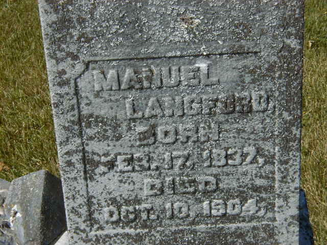 per "Family of Samuel Dingman of Cramahe", sent to me by Richard Hughes, Sept. 11, 2003.13 He was buried on 14 October 1904 at Stone's Cemetery, Percy Twp., Northumberland Co., Ontario; Memorial: (See Exhibit) Manuel; Langford; Born; Feb 17, 1837; Died; Oct. 10, 1904 (Stone's Cemetery, Percy Twp., June 25 2007) per "Family of Samuel Dingman of Cramahe", sent to me by Richard Hughes, Sept. 11, 2003.8