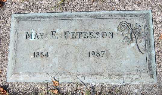 FindaGrave: Name: May E. Peterson; BIRTH: 1884; DEATH: 1957 (aged 72–73); BURIAL: Forest Lawn Cemetery, Bremerton, Kitsap County, Washington, USA; PLOT: Hope Section; MEMORIAL ID: 129232162 (https://www.findagrave.com/memorial/129232162/may-e.-peterson.)4,5