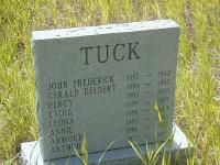 Gerald Delbert Tuck was born on 8 May 1898 at Haldimand Twp., Oak Heights, Northumberland Co., Ontario; Late Birth Reg'n.#501801: Name: Gerald Delbert Tuck; Date: May 8 1898; Place: Haldimand Twp., Northumberland Co; Father: John Frederick Tuck, 41, Eng., farmer, Oak Heights, b. Ont; Mother: Mary Ann Howard, 32, Eng., Oak Heights, b. Ont; Children: 8, all living; Inf.: Gerald D. Tuck, (Barrister in St. James, Manitoba); Reg'd.: May 15 1956 (Ontario Late Birth Registration, #501801-1956, ancestry.com) Date 1898 per Memorial. Date May 1898 & location Ont. per 1911 Census. Date May 8 1888 & location Ont. rural per 1901 Census. Date 1898 per marriage. Date May 8 1898 & location Colburne, Haldimand Twp. per family tree of csprickerhoff1 on ancestry.com, Jul 6 2012.1,5,2,3,6,4 He appeared on the census of April 1901 at Haldimand Twp., Northumberland Co., Ontario; Age 2 at 1901 Census: see John Tuck.3 He appeared on the census of 1911 at Haldimand Twp., Northumberland Co., Ontario; Age 13 at 1911 Census: see John Tuck.4 He lived on 29 June 1916 at 44 North St., St. Catherines, Ontario; Border Crossing Manifest: Name: Gerald Tuck; Age: 19; Born: Oak Heights, Ont; Last Permanent Res.: 44 North St., St. Catherines, Ont; Kin: Mary, mother, 68 W. Main St., Welland, Ont; Destination: Buffalo, NY, home of sister, Mrs. Evelyn Keeton; Reason: Seeling employment (ancestry.com.)7 He married Muriel ? after 1918; "Gerald Delbert, born 1898, married Muriel ... " from Oak Heights Neighbours, pg. 235. Gerald Delbert Tuck lived on 15 May 1956 at St. James, Manitoba; Informant for his own Late Birth Reg'n. - lawyer in St. James, Manitoba.8 He died in 1997; Date 1997 per Memorial.1 He was buried in 1997 at Red Cloud Cemetery, Cramahe Twp., Northumberland Co., Ontario; Memorial: (See Exhibit) TUCK; John Frederick 1857 - 1942; Gerald Delbert 1898 - 1997; Pecy 1893 - 1893; Lydia 1895 - 1895; Leona 1896 - 1900?; Annie 1887 - 1900?; Armour 1891 - 1900?; Arthur 1903 - 1903? (Red Cloud Cemetery, Cramahe Twp.) (Grass in front of dates??)1
