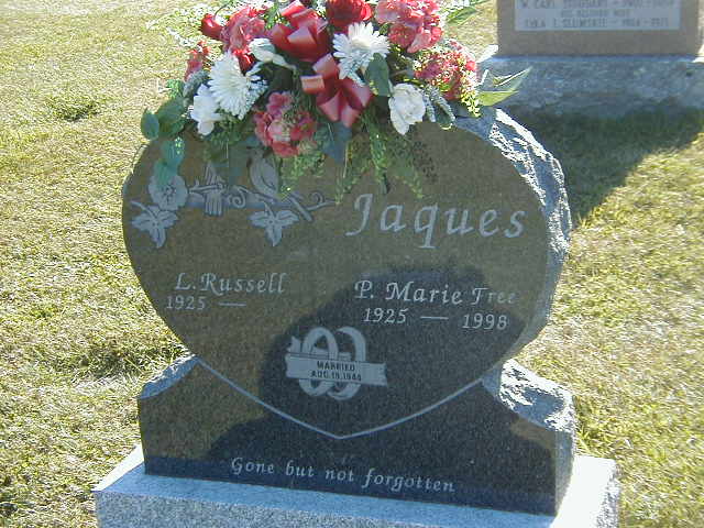 Lorne "Russell" Jaques was born on 13 June 1925 at Codrington, Northumberland Co., Ontario; Date Jun 13 1925 per Jaques Family Bible. He married P. Marie Free, daughter of Victor Cyril Free and Nettie Luella Thain, on 19 August 1944 at Campbellford, Northumberland Co., Ontario; Date per Russell Jaques. Date c 1923 & locaiton Whitby per GEDCOM of William James Donald Outram (www.doutram@yahoo.com) Jul 30 2015.1 Lorne "Russell" Jaques lived on 16 May 1987 at 121 Doxsee St., Campbellford, Northumberland Co., Ontario; Donation card at funeral of Louise Ames. He lived on 10 October 2000 at 121 Doxsee St., Campbellford, Northumberland Co., Ontario; I visited Russell Jaques at his home at 121 Doxsee Street, Campbellford. He lives alone since his wife, Marie, passed away three years ago. (Dan Buchanan.) He died on 6 January 2010 at Campbellford Memorial Hospital, Campbellford, Northumberland Co., Ontario, at age 84; Obituary: "JAQUES, L. Russell (Rus) ... Passed away at 2 am at Campbellford Memorial Hospital on January 6, 2010 in his 85th year. Beloved husband of the late Marie Jaques (Free). Dear father of Douglas Jaques & Carol of Peterborough, Betty Young & the late Gordon of Corbyville, Robert Jaques & Donna of Bethany, Randall Jaques, Tracey Eades & Bill all of Campbellford. Loving remembered by grandchildren Tony Jaques & Maria of Brampton, Wayne Young & Stacie of Toronto, Derek Young & Tina of Belleville, Jordan Jaques of Bethany, Kayla and Ryan Eades of Campbellford. Great grandfather of Josie & Matthew Jaques of Brampton, Christopher Young of Toronto, Ethan Young and Lauren Davis of Belleville. Son of the late Harry & Ollie Jaques and brother of the late Glenn Jaques (Anita). Friends are invited to call at the Weaver Family Funeral Home on Saturday, January 9 from 12 - 1 P.M. Service to follow in the E.W. Al Weaver Chapel at 1 P.M. Rev. Mark Fearnall officiating. Spring Interment at Mount Pleasant Cemetery. As expressions of sympathy, donations to the Campbellford Memorial Hospital Foundation would be appreciated by the family. Online Guest Book & Condolences at weaverfuneralhomes.com." Obit copied from www.weaverfunderalhomes.com, Jan 16 2010.