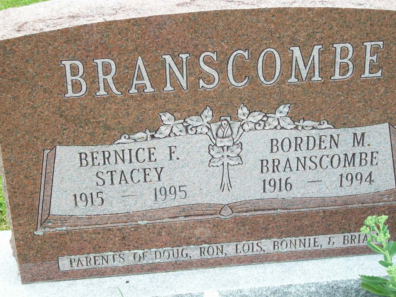 Borden M. Branscombe was born in 1916; Date 1916 per Memorial. per The McColl Clan: Scotland to Canada, by Leona M. Austin.1 He married Bernice F. Stacey, daughter of William James Stacey and Flossie May Rogers, before 1935 at Ontario. Borden M. Branscombe was buried in 1994 at McPhail's Cemetery, Brighton Twp., Northumberland Co., Ontario; Memorial: (See Exhibit) BRANSCOMBE; Bernice F; Stacey; 1915 - 1995; Borden M; Branscombe; 1916 - 1994 (McPhail's Cemetery, Jun 30 2008.)1 He died in 1994 at Ontario; Date 1994 per Memorial.1