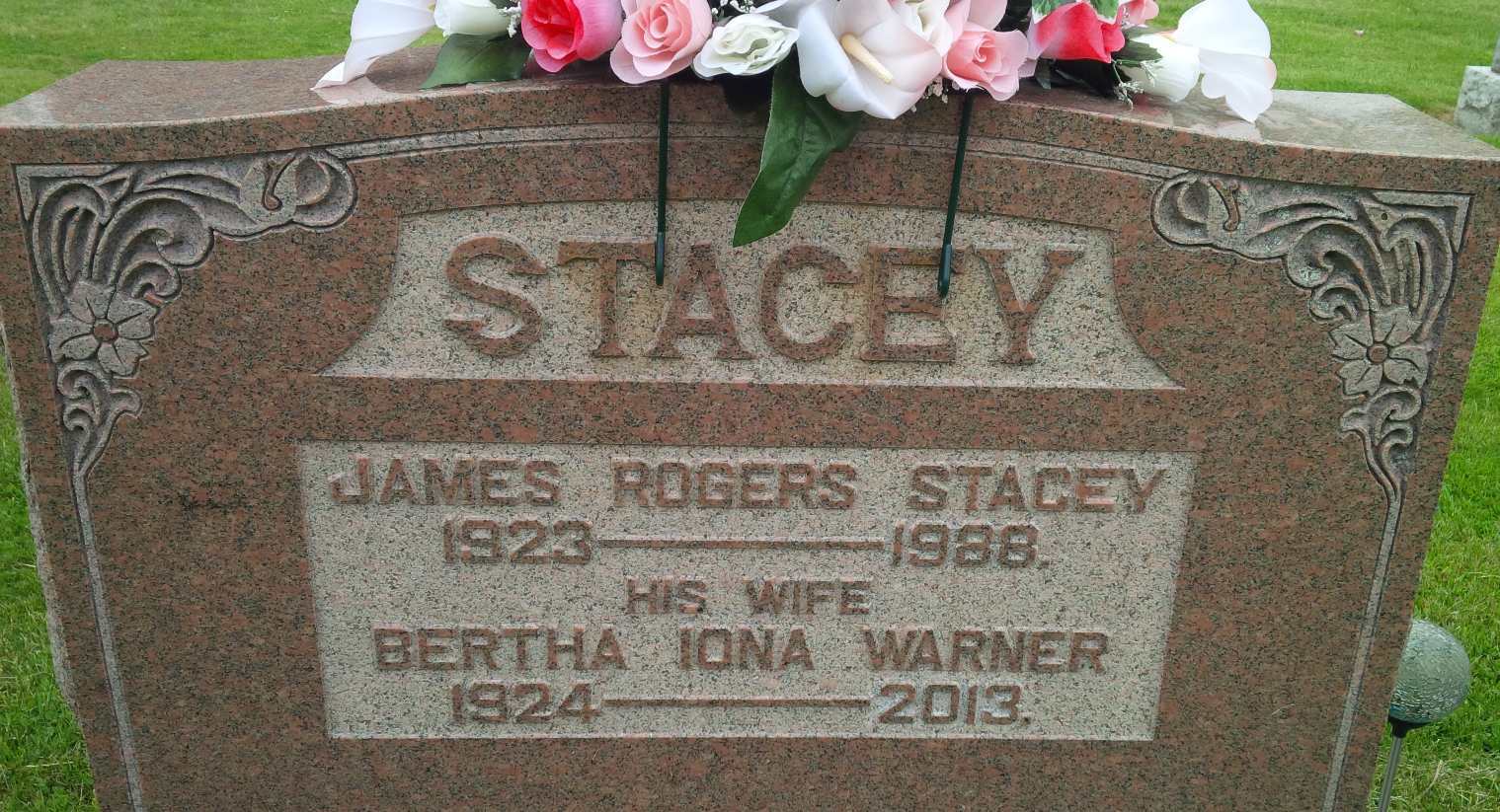 James Rogers Stacey was born in 1924 at Ontario; Date 1923 per Memorial. Date 1924 per The McColl Clan: Scotland to Canada, by Leona M. Austin.1 He married Bertha Iona Warner after 1944 at Ontario. James Rogers Stacey was buried in 1988 at McPhail's Cemetery, Brighton Twp., Northumberland Co., Ontario; Memorial: (See Exhibit) STACEY; James Rogers Stacey; 1923 - 1988; His Wife; Bertha Iona Warner; 1924 - 2013 (McPhail's Cemetery, Brighton Twp., June 12 2016, by Dan.)1 He died in 1988; Date 1988 per Memorial.1