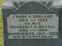 Francis Albert "Frank" Dorland was born on 1 May 1884 at Brighton Twp., Northumberland Co., Ontario; Date May 1884 per 1911 Census. Date May 1 1884 per 1901 Census. Date 1885 & location Ont. per 1891 Census. Date May 1 1884 & location Br. Twp. per GEDCOM of John Maybee, June 10, 2005. per The McColl Clan: Scotland to Canada, by Leona M. Austin.1,3,4,5 He appeared on the census of April 1891 at Brighton Twp., Northumberland Co., Ontario; Age 6 at 1891 Census: see Willet Casey Dorland.5 He appeared on the census of April 1901 at Brighton Twp., Northumberland Co., Ontario; Age 16 at 1901 Census: see Willet Casey Dorland.3 He lived on 14 September 1904 at Murray Twp., Wooler, Northumberland Co., Ontario; Witness at marriage of George Athur Free & Ethel McColl.2 He married Margaret Edna "Maggie" McColl, daughter of Samuel Hugh McColl and Eunice Fraleigh, on 7 December 1904 at Murray Twp., Wooler, Northumberland Co., Ontario; Marriage Reg'n.#013723: Groom: Francis Albert Dorland; Age: 20; Res. & Born: Brighton Twp; Status: bachelor; Occ.: farmer; Parents: Willet C. Dorland & Elizabeth Maybee; Bride: Maggie Edna McColl; Age: 19; Res.: Campbellford; Born: Murray Twp; Status: spinster; Parents: Samuel McColl & Eunice Fralick; Wit.: Clinton R. Terrill, Wooler & Leah Pickworth, Colborne; Date: Dec 7 1904; Place: Wooler; Rel.: Meth; Performed by: Rev. S. F. Dixon; Reg'd.: Dec 1904; Reg'r.: Wm Little (Ontario Marriage Registration, #013723-1904, ancestry.com) Date Dec 7 1904 per GEDCOM of John Maybee, June 10, 2005.1,6 Francis Albert "Frank" Dorland lived in June 1911 at Conc 6 Lot 28, Brighton Twp., Northumberland Co., Ontario; Residence per 1911 Census: Conc 6, Lot 28, Brighton Twp.4 He appeared on the census of June 1911 at Brighton Twp., Orland, Northumberland Co., Ontario; Age 27 at 1911 Census: Dorland, Francis A., 27, b. Ont. May 1854, Ger., Meth., farmer, married; Maggie Edna, 26, b. Mar 1855, Scot., Meth., married; Willet Aylmer, 5, b. Oct 1905, son, Ger; Lloyd Edwin, 3, b. Sept 1907, son (Conc 6, Lot 28) (1911 Census Image from Archives Canada Web site: Orland, page 7, line 27.)4 He Frank Dorland appears in The Latimer Photos which were taken by Hugh Latimer during the late 1920s and early 1930s at his father's General Store in Orland. (The Latimer Photos, Codrington Public Library) circa 1930 at Brighton Twp., Orland, Northumberland Co., Ontario.7 He died on 30 August 1953 at Belleville General Hospital, Belleville, Hastings Co., Ontario, at age 69; Date Aug 30 1953 per GEDCOM of John Maybee, June 10, 2005. Location Belleville per Genealogy for Margaret Lillian (Dorland) Peister, Tweedsmuir Histories, Reel 2.1,8 He was buried on 3 September 1953 at McPhail's Cemetery, Brighton Twp., Northumberland Co., Ontario; Memorial: (See Exhibit) Frank A. Dorland; 1884 - 1953; His Wife; Margaret E. McColl; 1885 - 1966; Marguerite, 1912 - 1923; Dau'r of F. A. & M. E. Dorland (McPhail's Cemetery, Brighton Twp.)9