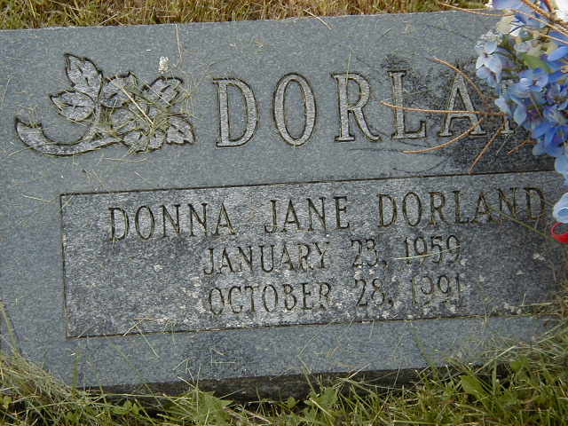 Donna Jane Dorland was born on 23 January 1959 at Ontario; Date Jan 23 1959 per Memorial. per The McColl Clan: Scotland to Canada, by Leona M. Austin.1 She died on 28 October 1991 at Ontario at age 32; Date Oct 28 1991 per Memorial.1 She was buried on 31 October 1991 at McPhail's Cemetery, Brighton Twp., Northumberland Co., Ontario; Memorial: (See Exhibit) DORLAND; Donna Jane Dorland; January 23, 1959; October 28, 1991 (McPhail's Cemetery, Brighton Twp.)1